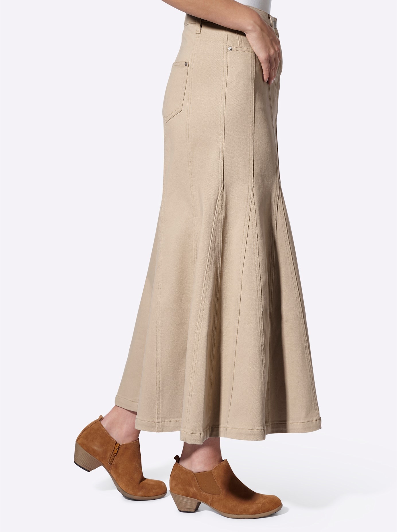 Twillrock 5-Pocket-Style in femininer Godet-Form. Unterstützt die Initiative Cotton made in Africa. 98% Baumwolle, 2% Elasthan. Maschinenwäsche., Material: Materialzusammensetzung: 98% Baumwolle, 2% Elasthan, Pflegehinweise: Maschinenwäsche, Optik/Stil: Optik: unifarben, Farbe: Farbbezeichnung: beige, Passform/Schnitt: Schnittform Länge: lang, Details: Verschluss: Knopf, Reißverschluss