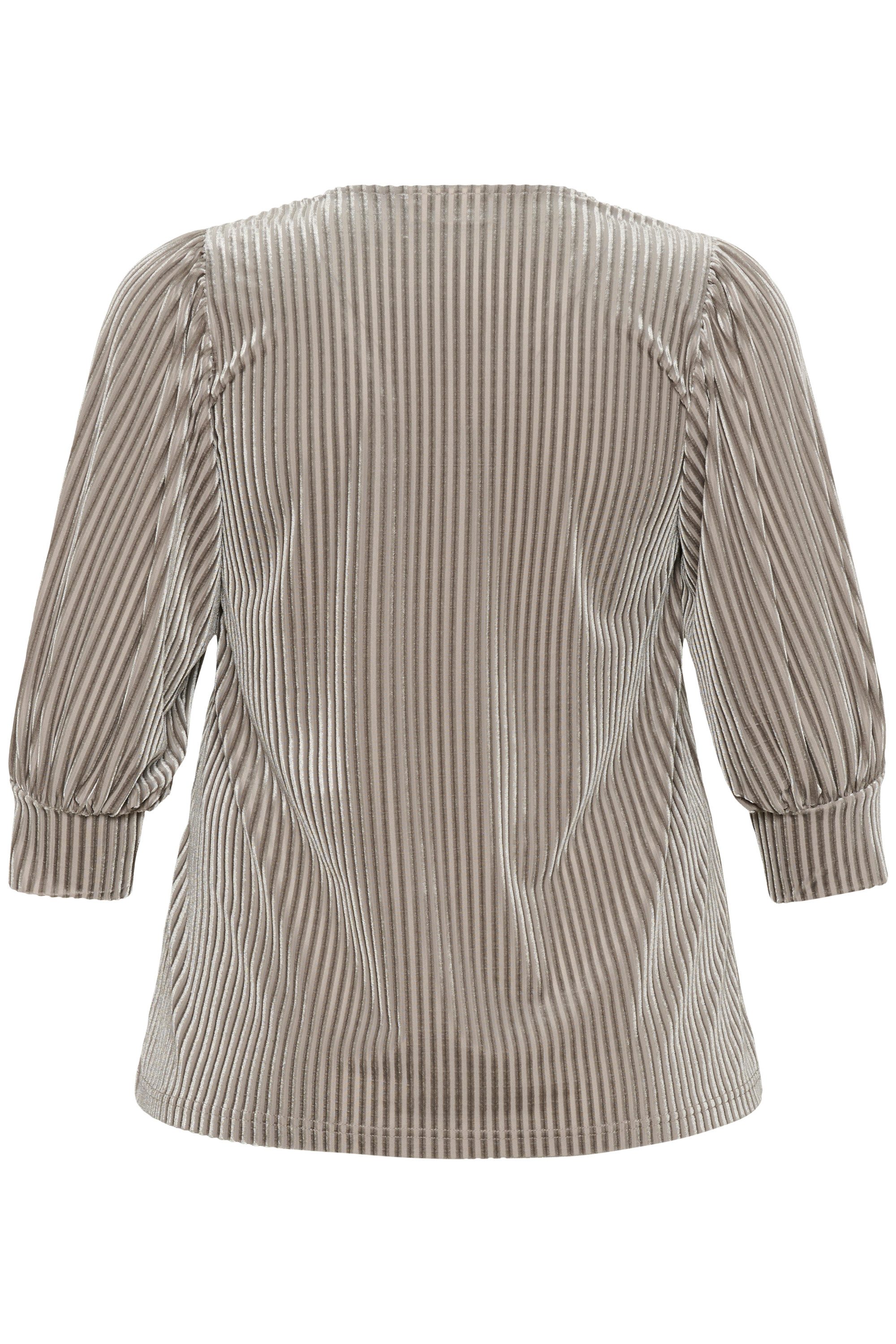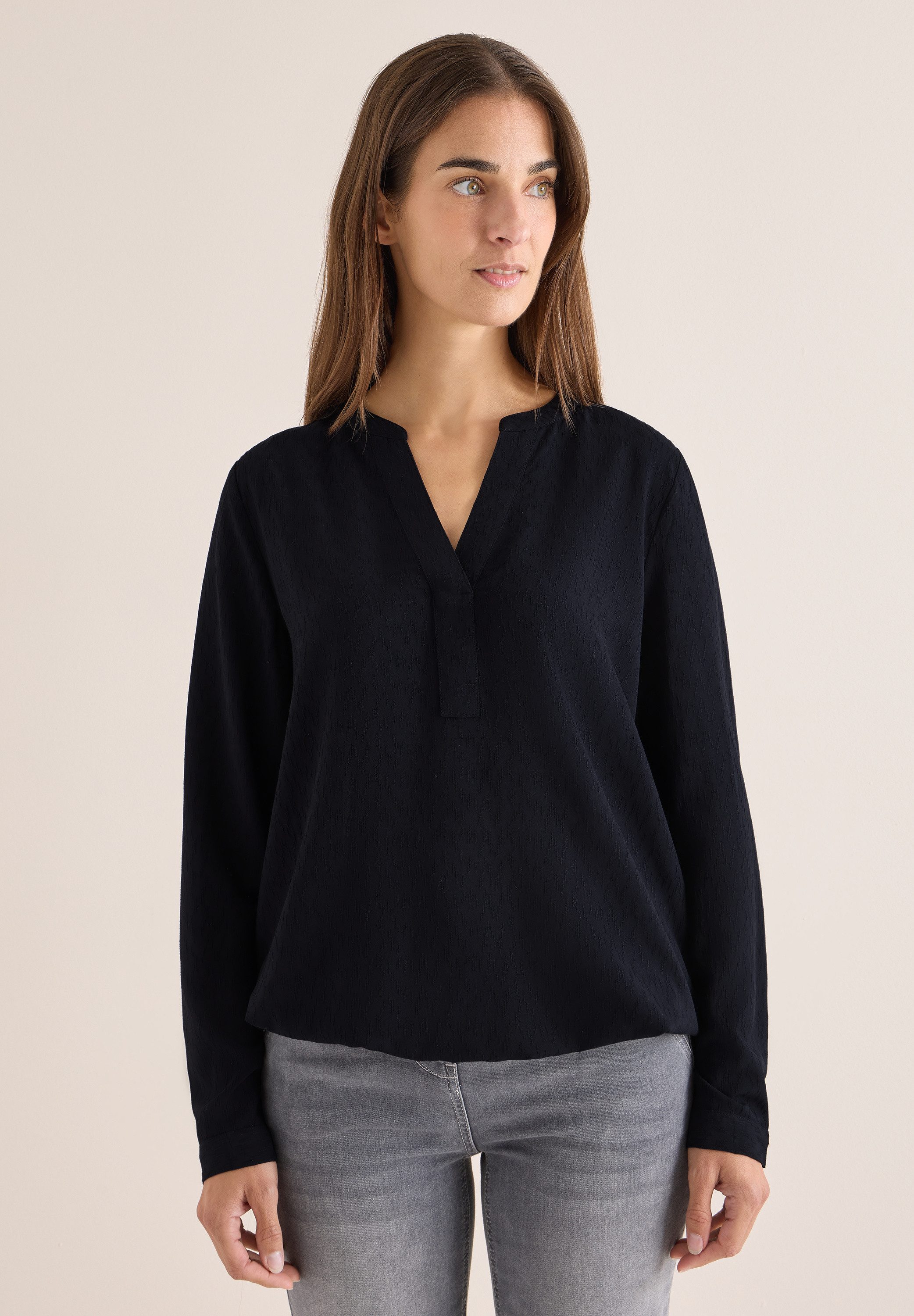 Diese Damenbluse präsentiert einen V-Ausschnitt, weite 3/4-Ärmel und eine entspannte Passform. Sanft strukturiert für Komfort und vielseitige Kombinationsmöglichkeiten.