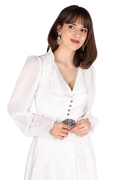 Dieses faszinierende, lange Hochzeitsdirndl Marianna besteht aus herrlich glänzendem Jacquard und hat allover ein hinreißendes, florales Ornamentik-Webmuster mit eingewebten Motiven in unterschiedlichen Glanz-Nuancen und mit leicht hervorgehobenen Konturen. Sowohl der schöne Schneewittchen-Kragen als auch der leicht herzförmige Unterbrust-Ausschnitt werden von edler Perlen- sowie Posamentenborte umrahmt. Der Kragen, der Ausschnitt und die Armausschnitte am sauber abgefütterten Mieder sind abgepaspelt. Die Knopfleiste des traumhaften Brautdirndls schmücken altsilberne Ösenknöpfe in Blütenform, jeweils veredelt mit einem glitzernden Strasssteinchen. Der bodenlange, wundervoll fließende Rock in A-Linie verfügt über einen integrierten Unterrock in Satin-Art. Perfekt wird das exquisite Festdirndl durch die bezaubernde, zarte Tüllschürze, die von einem elastischen Schürzenband gehalten wird. Das Band aus Dirndlstoff hat eine märchenhafte, altsilberne Metallschließe im Ornamentik-Ajour-Design zum Einhaken. Die zarte, am Bund geraffte Tüllschürze zieren im oberen Bereich gestickte Ornamentikblumen-Arrangements und unten edel gestickte, florale Ornamente. Die stilvoll schimmernden Stickereien haben leicht betonte Konturen und sind mit unzähligen, glanzvollen Perlen geschmückt. Der Schürzenabschluss ist wellenförmig gestaltet. Im Lieferumfang ist das lange Dirndl mit Schürze enthalten, eine Dirndlbluse und ein Petticoat sind nicht inbegriffen. Bitte beachten Sie den Größenzuschlag ab Größe 48. Rückenlänge (gemessen an Referenzgröße 34): ca. 40 cm Rocklänge: ca. 98 cm Gesamtlänge: ca. 138 cm Material Dirndl: 55% Polyester, 45% Viskose Miederfutter: 65% Polyester, 35% Baumwolle Material Unterrock: 100% Acetat Material Schürze: 100% Polyester Farbe: Offweiß Größen: 32 - 52 Handwäsche