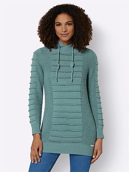 Der Longpullover schmeichelt der Figur durch das beidseitige diagonale Strukturmuster und streckt gleichzeitig durch die lange Form. Der Clou ist der voluminöse, asymmetrische Rollkragen in Rippenstrick mit Durchzugband und Stoppern in Leder-Optik. Attraktiver Look durch das effektvolle Strukturmuster in Biesen-Optik im Vorderteil und an den Ärmeln. Aufwendig in Form gestrickt. Lange Ärmel und Saum mit Rippbündchen. Unterstützt die Initiative Cotton made in Africa.
