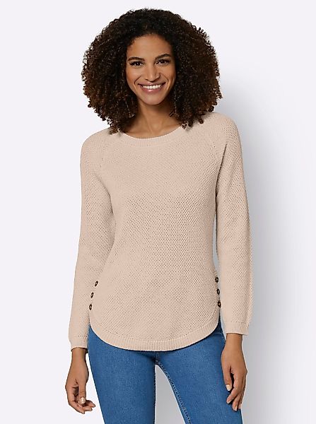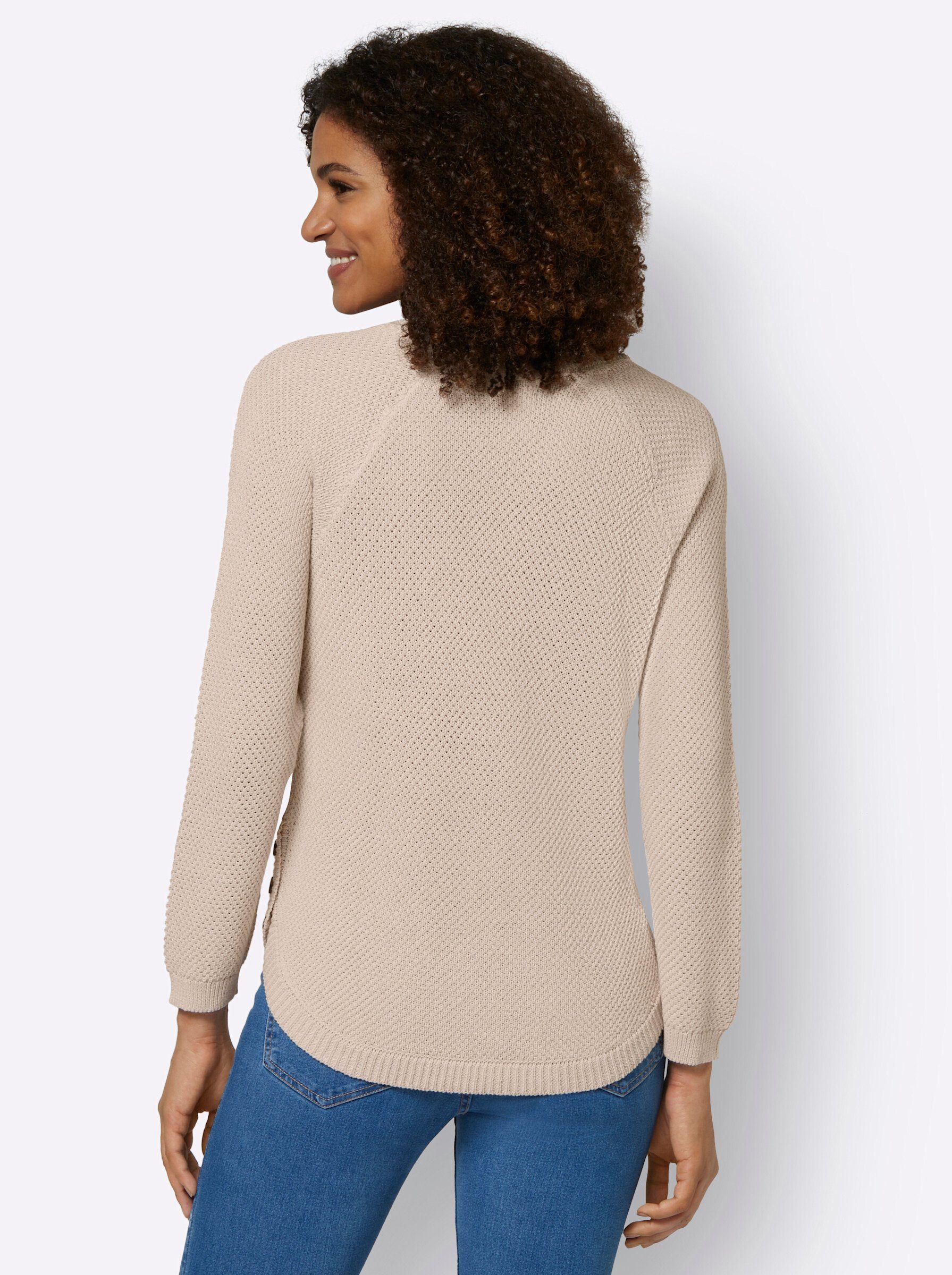 Blickfang bei diesem Pullover in Struktur-Strick allover ist der Rippabschluss am abgerundeten Saum mit seitlichen Zierknöpfen. Ebenfalls gerippt sind der Rundhals-Ausschnitt und die Bündchen der langen Raglanärmel. Passformgerecht gestrickt.