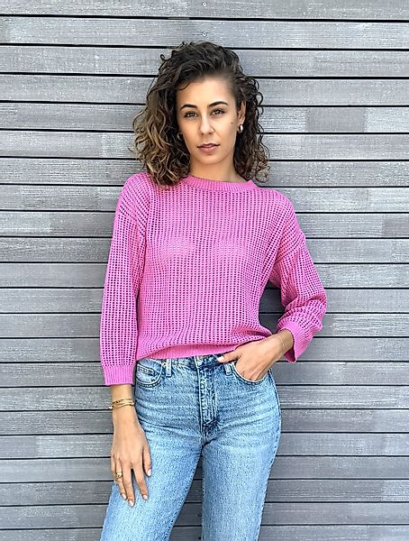 Der Zuckerwatte Pullover ist ein Halbarmpullover aus luftigem Ajourstrick, der perfekt für die wärmeren Tage geeignet ist. Hergestellt aus feiner Baumwolle und in einer kurzen, modischen Form, ist dieser Pullover ein vielseitiges Kleidungsstück für jede Frau. Der Pullover wird in Europa hergestellt und besticht durch seine hochwertige Verarbeitung und das angenehme Tragegefühl. Die zarte Farbe und das luftige Strickmuster machen diesen Pullover zu einem echten Blickfang in jedem Kleiderschrank. Unser Model 176 cm groß und trägt Größe S.
