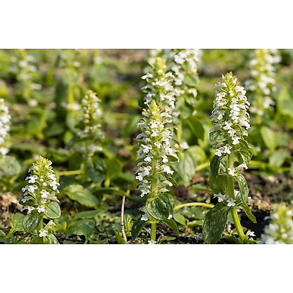 Ajuga reptans ‘Alba’, der weißblühende Günsel (Kriechender Günsel), ist eine robuste, immergrüne Staude und bewährte Bodendeckerpflanze, die mit leuchtend weißen Blütenähren im Frühling begeistert. Von April bis Juni erheben sich die eleganten, reinweißen Blüten über dichtem, glänzend grünem Laub, das in Rosetten angeordnet ist und ganzjährig eine attraktive Teppichstruktur bietet. Der Wuchs ist flach, kriechend und teppichbildend, erreicht meist 10 bis 15 cm Höhe und breitet sich über Ausläufer zuverlässig zu einem geschlossenen, pflegeleichten Flächendecker aus. Als Gartenstaude eignet sich Ajuga reptans ‘Alba’ hervorragend zur Begrünung von Beeten, Vorgärten und Gehölzrändern, für Steingärten, Gräber, Wegränder und Einfassungen sowie zur Unterpflanzung von Ziersträuchern und Rosen; auch in Schalen oder als Unterpflanzung in größeren Kübeln auf der Terrasse macht der Blütenstauden-Teppich eine gute Figur. Bevorzugt werden halbschattige bis schattige Standorte, in sonniger Lage ist eine gleichmäßig frische bis feuchte, humose und gut durchlässige Erde wichtig, damit das Laub vital bleibt und die Blüte üppig ausfällt. Der Günsel ist anspruchslos, winterhart und dank seines dichten Wuchses ausgesprochen konkurrenzstark gegenüber Unkraut; ein Rückschnitt der Blütenstände nach der Blüte hält den Polstercharakter kompakt. Bei Bedarf lassen sich die Horste im Frühjahr teilen und versetzen, um Lücken zu schließen oder neue Flächen zu begrünen. So entsteht ein geschlossener, dekorativer Teppich, der Beete strukturiert, Wege säumt und schattige Partien im Garten wirkungsvoll aufhellt.