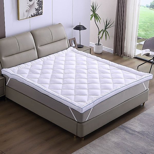 Extra dicke Füllung – Luxus für Ihren Schlaf Genießen Sie unvergleichlichen Schlafkomfort mit unserem Ambiness Topper, der durch seine beeindruckende 7 cm dicke Mikrofaser-Füllung überzeugt. Mit einer Füllmenge von 1000 g/m² sorgt er für ein außergewöhnlich weiches und kuscheligesLiegegefühl. Die durchdachte Rautensteppung fördert die Luftzirkulation und unterstützt die natürliche Temperaturregulierung – für ein angenehm frisches Schlafklima zu jeder Jahreszeit. Gleichzeitig verleiht sie dem Topper eine elegante und strukturierteOptik, die ihn luxuriös und hochwertig wirken lässt. Dieser Topper ist der Schlüssel zu entspannten und erholsamen Nächten. Hypoallergene Textilfaser – Hygiene und Komfort vereint Die hochwertige Mikrofaser des Ambiness Matratzentoppers überzeugt durch ihre hypoallergenen, bakterien- und milbenhemmenden Eigenschaften, die ein sauberes und gesundesSchlafklima fördern. Ideal für Allergiker und Menschen mit empfindlicher Haut, bietet er zuverlässigen Schutz und angenehme Behaglichkeit. Maschinenwaschbar bis 40°C, ist der Topper besonders pflegeleicht und bleibt dauerhaft hygienisch frisch – für einen erholsamen Schlaf, Nacht für Nacht. Formstabilität &, sicherer Halt Die doppelt genähten, blauen Paspeln verleihen dem Ambiness Jacquard Topper eine stabile Form und setzen gleichzeitig einen eleganten Akzent. Fixierbänder an allen vier Ecken sorgen für einen festen Halt auf der Matratze, sodass der Topper sicher an Ort und Stelle bleibt. Zusätzlich wird das Füllmaterial durch die Steppnähtegleichmäßigverteilt und fixiert, wodurch die Langlebigkeit und Formbeständigkeit der Textilien erhöht wird. Diese clevere Kombination aus Stabilität und Funktionalität garantiert ein stets ordentliches und einladendes Bett – für besten Schlafkomfort ohne Verrutschen. Unbegrenzte Einsatzmöglichkeiten – Ein Upgrade für jede Liegefläche Warum gleich eine teure neue Matratze kaufen, wenn Sie mit unserem Ambiness Topper Ihre vorhandene Liegefläche in ein luxuriöses Schlafparadies verwandeln können? Ob Ihre Matratze zu hart, unbequem oder in die Jahre gekommen ist – der Topper sorgt für weiche, stützende Bequemlichkeit und kann die Lebensdauer Ihrer Matratze verlängern. Er glättet störende Besucherritzen und verwandelt Gästebetten, Schlafsofas oder sogar Camperbetten in angenehme Schlafplätze. Selbst auf aufblasbare Matratzen oder Sofas genießen Sie erholsamen Schlaf. Zuhause, unterwegs oder bei Gästen – jede Liegefläche fühlt sich wie Ihr eigenes Bett an. Praktisch für jeden Alltag: Der Ambiness Topper lässt sich zusammenrollen, vakuumieren und platzsparend verstauen, wenn er nicht benötigt wird. Perfekt für alle, die Flexibilität und Komfort schätzen – egal, wo sie schlafen. Warum dieser Ambiness Topper? Kuschelige Mikrofaser-Füllung: Die 7 cm dicke Füllung bietet ein angenehm weiches Liegegefühl.Formhaltende blaue Paspeln: Stabilisiert den Topper, wirkt elegant und setzt einen stilvollen Akzent.Hygienisch &, hypoallergen: Die hochwertige Mikrofaser ist ideal für Allergiker und Menschen mit empfindlicher HautFlexibel einsetzbar: Für jede Matratze, jedes Sofa und jeden Camper geeignetPlatzsparend: Rollbar, vakuumierbar und leicht zu verstauen 30 Nächte Probeschlafen Wir sind überzeugt, dass unser hochwertiger Jaquard Topper Sie begeistern wird. Deshalb bieten wir Ihnen 30 Nächte, um ihn in Ruhe zu testen. Jetzt bestellen und den Schlaf genießen, den Sie verdienen Gönnen Sie sich den Luxus eines erholsamen Schlafs und wachen Sie erfrischt und voller Energie auf. Machen Sie keine Kompromisse, wenn es um Ihre Nächte geht – bestellen Sie jetzt und erleben Sie den Unterschied selbst. Ihr Schlafparadies wartet auf Sie! Technische Daten: Maße: 80x200cm (Bitte messen Sie von der Innenkante des Bettes)Gewicht: 1,9kgBezug mit Mikrofaserfüllung bis 40°C maschinenwaschbar Ganzjährig nutzbare Matratzenauflage40cm lange Fixierbänder an jeder EckeBezug Obermaterial: Mikrofaser 100% Polyester 80g/m²Füllung: 100% Hohlfaser-Mikrofaser Polyester 1000g/m² Lieferumfang: Ambiness Matratzentopper JAQUARD 7cm1 Paket