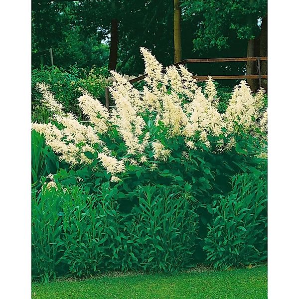 Aruncus sinensis Zweiweltenkind, der Chinesische Geißbart, ist eine elegante Blütenstaude mit fernartig gefiedertem, frischgrünem Laub und zarten, cremeweißen bis elfenbeinfarbenen Blütenrispen, die im Frühsommer erscheinen und dem Garten eine luftig-leichte Struktur verleihen. Der horstbildende Wuchs wirkt aufrecht und zugleich locker, junge Triebe treiben oft bronzerot aus und vergrünen im Verlauf, im Herbst zeigt das Laub eine warme, gelblich-goldene Färbung. Als robuste Gartenstaude setzt der Geißbart im schattigen bis halbschattigen Beet, am Gehölzrand oder im naturnahen Waldgarten edle Akzente und eignet sich sowohl als Solitär für den Vorgarten als auch für die harmonische Gruppenpflanzung in Kombination mit Farnen, Hosta oder Astilben. Auch als zurückhaltend wirkende Kübelpflanze auf der schattigen Terrasse überzeugt Aruncus sinensis durch seinen filigranen, zugleich standfesten Habitus und die dekorativen Blütenstände, die sich zudem gut als Schnittblumen für sommerliche Arrangements verwenden lassen. Bevorzugt wird ein humoser, nährstoffreicher, gleichmäßig frischer bis feuchter Boden ohne Staunässe; in sandigeren Substraten sorgt die Beimischung von Kompost und Laubhumus für dauerhaft vitale Entwicklung. Ein Standort mit Morgen- oder Abendsonne und kühler Bodenmulch hält die Staude vital, regelmäßiges Wässern in Trockenperioden und ein vorsichtiger Rückschnitt der abgeblühten Rispen genügen als Pflege. Nach einigen Jahren lässt sich der kompakte Horst teilen, um Bestände zu verjüngen und weitere Beete mit diesem aparten Blütenstauden-Klassiker zu bereichern.