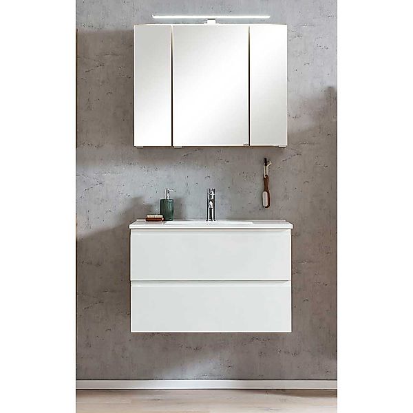 Badmöbel mit Becken und Spiegelschrank 80 cm breit (zweiteilig) - Zweiteilig - Zerlegt, zum leichten Selbstaufbau (Montageanleitung liegt bei) - In modernem Design - Breite Variante ist mind. benötigte Gesamtfläche, Einzelmaße sind unten separat aufgeführt - Mit LED Beleuchtung - Aus deutscher Produktion - Für Energieeffizienzklasse LED - Badezimmer-set aus Spanplatte, Spiegelglas und MDF - Bad-set in Weiß und Wildeichefarben - Melaminbeschichtet, foliert und Dekor tiefgezogen - Badmöbelkomplettset 80 cm Breit, 122 cm Hoch, 47 cm TiefInformationen zur Lieferung:Der Versand dieses Artikels erfolgt per DHL Paketdienst (Deutsche Post). Sollten Sie bei der Erstzustellung nicht angetroffen werden, hinterläßt der Zusteller in Ihrem Briefkasten eine Benachrichtigungskarte. Sie können die Ware dann in Ihrer Postfiliale vor Ort abholen. Die Auslieferung erfolgt von Montags bis Samstags. Eine Zustellung an Sonn- und Feiertagen ist nicht möglich.
