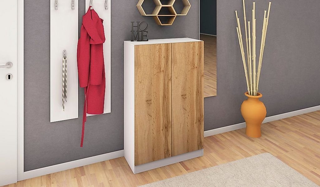 Dieser elegante Schuhschrank ist ein echter Hingucker! In tollen Farbdekoren bietet er viel Platz für eine Menge Schuhe, aber auch für andere persönliche Dinge. Die Highlights dieses Schuhschrankes stellen die Push-To-Open-Funktion und der große Stauraum dar. Dieser Artikel verfügt über zwei Türen auf Metallscharnieren und fünf höhenverstellbare Holzeinlegeböden. Längs passen ca. 18 Paar Schuhe in der max. Größe 45 (ca.) hinein. Quer passen auch größere Schuhe hinein; die Anzahl der Paare kann dadurch jedoch reduziert werden., Ausstattung & Funktionen: Anzahl Fächer: 1 Stk., Anzahl Holzeinlegeböden: 5 Stk., Anzahl Schuhe (ca.): 18 Stk., Anzahl Türen: 2 Stk., Art Einlegeböden: lose, variabel einsetzbar, Art Türen: Drehtüren, Ausstattung: Push-to-open-Funktion, Maßangaben: Breite: 76 cm, Tiefe: 35 cm, Höhe: 120 cm, Gewicht: 40 kg, Belastbarkeit maximal: 50 kg, Breite Einlegeböden: 72 cm, Tiefe Einlegeböden: 30 cm, Stärke Einlegeböden: 1,5 cm, Belastbarkeit Einlegeböden maximal: 10 kg, Breite Fachinnenmaß: 72 cm, Tiefe Fachinnenmaß: 31 cm, Höhe Fachinnenmaß: 109 cm, Höhe Sockel: 8 cm, Hinweis Maßangaben: Alle Angaben sind ca.-Maße., Material: Material: Spanplatte, Material Korpus: Spanplatte, Material Türen: Spanplatte, Material Oberboden: Spanplatte, Material Rückwand: MDF, Material Scharniere: Metall, Material Bodenträger: Kunststoff, Material Einlegeböden: Spanplatte, Farbe: Farbbezeichnung: weiß/eichefarben wotan, Farbe Türen: Front: eichefarben wotan, Farbe Einlegeböden: weiß, Farbhinweise: Bitte beachten Sie, dass bei Online-Bildern der Artikel die Farben auf dem heimischen Monitor von den Originalfarbtönen abweichen können., Optik/Stil: Oberflächenoptik Front: matt, Oberflächenoptik Korpus: matt, Lieferung & Montage: Lieferumfang: Aufbauanleitung, Montagematerial, Lieferzustand: zerlegt, Art Montage: stehend montierbar, Anzahl Packstücke: 2 Stk., Aufbauhinweise: einfache Selbstmontage mit Aufbauanleitung, Hinweise: Pflegehinweise: feucht abwischbar, Lieferzustand Batterien / Akkus: Keine Batterien beigelegt, Warnhinweise: Artikel mit beiliegender Wandbefestigung an die Wand fixieren, Wissenswertes: Wissenswertes: längs passen ca. 18 Paar Schuhe in der max. Größe 45 (ca.) hinein, quer passen auch größere Schuhe hinein, die Anzahl der Paare kann dadurch jedoch reduziert werden, Serie: Serie: Vaasa