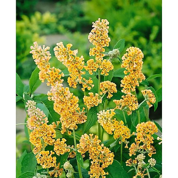 Buddleja x weyeriana, der Schmetterlingsstrauch, präsentiert sich als ausdrucksstarker Blütenstrauch mit besonderem Charme und vereint die Robustheit von Buddleja davidii mit dem Charakter der kugeligen Blüten von Buddleja globosa. Seine warmgelben bis aprikotfarbenen, teils ballförmig angeordneten Blüten in lockeren Rispen erscheinen über einen langen Zeitraum von Hochsommer bis in den Herbst und verströmen einen angenehmen Duft. Das lanzettliche, graugrüne Laub bildet einen attraktiven Kontrast zu den leuchtenden Blüten, während der Wuchs aufrecht und zugleich locker überhängend wirkt, wodurch ein lebendig-dynamisches Bild entsteht. Als Zierstrauch für sonnige Beete, Vorgärten und Rabatten überzeugt Buddleja x weyeriana ebenso wie als Solitär im Rasen oder als markanter Gartenstrauch in Gruppenpflanzung; in großzügigen Kübeln auf der Terrasse kommt die Blütenfülle ebenfalls hervorragend zur Geltung. In freiwachsenden, lockeren Blütenhecken setzt dieser Strauch rhythmische Akzente und sorgt für saisonale Höhepunkte. Ein vollsonniger, warmer Standort und ein durchlässiger, eher nährstoffreicher Boden ohne Staunässe sind ideal; leichte, sandig-kiesige Substrate werden gut vertragen. Nach dem Winter empfiehlt sich ein kräftiger Rückschnitt bis auf kräftige Triebe, um den Neuaustrieb und die reiche Blütenbildung anzuregen, zudem verlängert regelmäßiges Ausputzen verwelkter Rispen die Blütezeit. Der schnellwachsende Gartenstrauch erreicht je nach Standortbedingungen eine stattliche Höhe und bleibt dabei formschön und vital. Mit seiner harmonischen Kombination aus Farbe, Duft und elegantem Wuchs bereichert Buddleja x weyeriana jeden sonnigen Gartenraum.