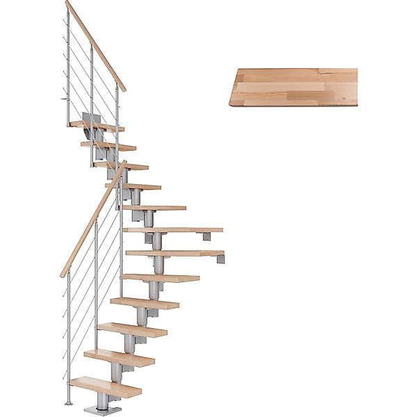 Die Mittelholmtreppe Dublin von Dolle ist mit einem einseitigen Edelstahlgeländer, mit Geländerpfosten, mitlaufenden Edelstahlstäben und einem Holzhandlauf ausgestattet. Der Mittelholm sowie die Geländerstäbe/-pfosten sind aus pulverbeschichtetem Metall gefertigt. Dieses Nebentreppenmodell mit geraden Stufen eignet sich besonders gut für den Selbsteinbau. Das moderne Design macht diese Treppe mit Mittelholm zu einem idealen Wohnraumgestalter für kleinere Räume. 11 Stufen aus Buche, lackiert. Geschosshöhe 222 - 270 cm. Treppenbreite: 75 cm. Treppenlaufrichtung: 1/4 gewendelt links oder rechts. Unterkonstruktion und Geländerpfosten perlgrau pulverbeschichtet.