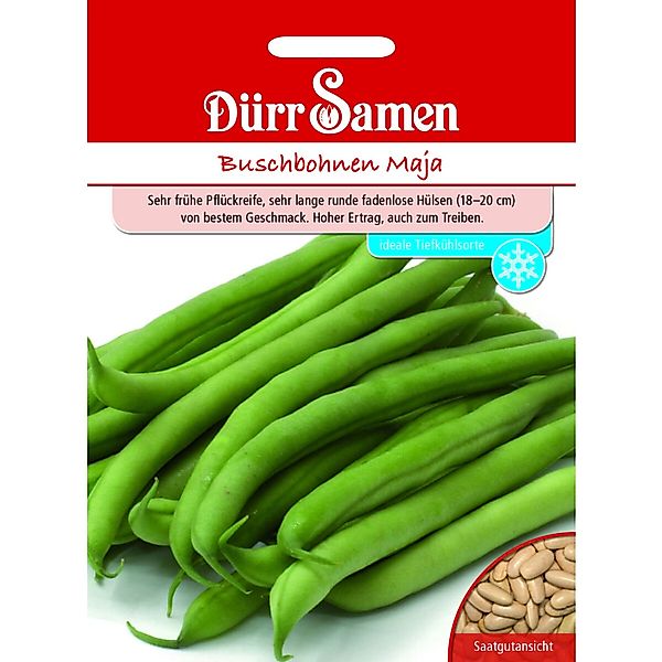Info: Maja gehört zu den frühesten Sorten, ist bewährt und bringt hohe Erträge. Die Hülsen sind fadenlos, 18–20 cm lang und dunkelgrün. Durch die schnelle Entwicklungszeit speziell auch für späte Aussaaten geeignet. Aussaat: Ab Anfang Mai, wenn keine Nachtfröste mehr zu erwarten sind. Spätere Aussaaten sind bis Ende Juli möglich. Saattiefe 3–5cm. Keimung: Die Keimung erfolgt erst ab ca. 10°C, die Aussaat sollte nicht in nassen, kalten Böden erfolgen. Frühere Vorkultur im Topf möglich. Kultur: Reihenabstand 50-60cm, in der Reihe 8–10cm. Bei Horstsaat Reihenabstand 50cm und alle 40cm 3 Korn auslegen. Standort: Sonnige, warme und windgeschützte Lage. Humoser, lockerer, sandig–lehmiger Boden ist günstig. Schwere Böden vor Aussaat unbedingt auflockern. Blüte/Ernte: Erste Ernte ca. 10 Wochen nach der Aussaat. Späte Aussaaten bis zum Frost. Bohnen nie bei Nässe anfassen oder ernten. Verwendung: Sehr vielseitig verwendbar, für Bohnengemüse, Salate, zum Einmachen und Einfrieren. Enthält die Vitamine A, B und C und wertvolle Mineralien. Inhalt: 120 Korn