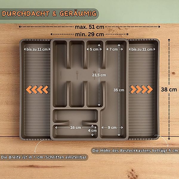 Engelland Besteckkasten Ausziehbarer Besteckeinsatz für Schubladen 30-50 cm (Vorteils-Set, 1 St., 29 - 51 x 38 x 5 cm, variabel ausziehbar, für alle Schubladen), 8 Fächer, robust, Kunststoff, Besteckkorb, Besteckhalter, Organizer