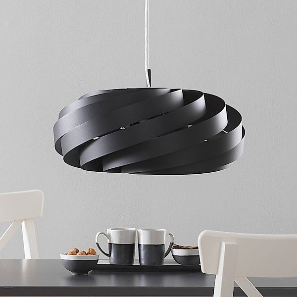 In Schwarz: Hängeleuchte Vento mit spiralförmigem Schirm Die Hängeleuchte Vento stellt schon ausgeschaltet ein auffälliges Einrichtungsaccessoire dar. Sobald jedoch das Licht eingeschaltet wird, tritt der besondere Reiz des Schirms, der aus spiralförmig zusammengefügten Metallbändern besteht, hervor. Die Hängeleuchte Vento eignet sich zum Einsatz aller Arten von Leuchtmittel mit Sockel E27, auch zeitgemäße LED-Lampen können eingesetzt werden. Das abstrahlende Licht erzeugt im Zusammenspiel mit den Lücken zwischen den Metallbändern einen auffälligen Lichteffekt.