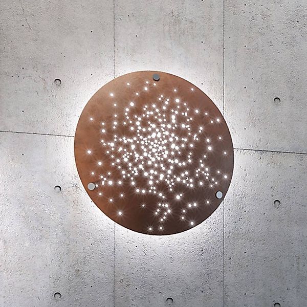 Einzigartige LED-Designer-Wandleuchte Lens Von der tschechischen Designerin Lucie Koldova entworfen, dient die LED-Wandleuchte Lens als eindrucksvoller Einrichtungsgegenstand und dekorative Lichtquelle für geräumige und hochwertig eingerichtete private wie öffentliche Bereiche. Der Einsatz an der Decke ist ebenso möglich. Das Finish des Schirms entsteht in einem aufwendigen handwerklichen Prozess. Nach einer mittels Feuer erzielten Oxidation der Oberfläche wird diese gebürstet, abgeschwämmelt, poliert und geschliffen. Jedes einzelne Exemplar der Lens erhält so eine einzigartige Note. Das Licht des LED-Strips fällt auf einen linsenförmig konvex gebogenen Schirm und durch dessen unregelmäßig angeordnete, unterschiedlich große runde Öffnungen in den Raum. Die Gestaltung mag an ein antikes Schutzschild oder den nächtlichen Sternenhimmel erinnern - der Fantasie des Betrachters setzt Lens keine Grenzen.