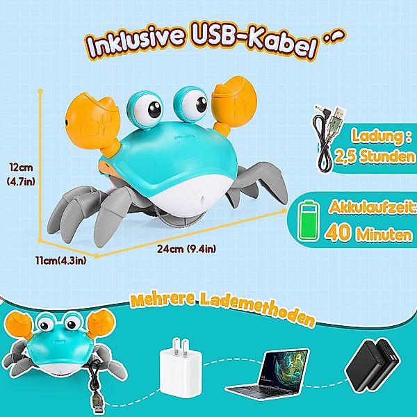 Krabben Baby Spielzeug Dies ist ein lustiges und interaktives Krabbelspielzeug für Kleinkinder. Die Krabbe wird beim Krabbeln von Musik begleitet und gleichzeitig leuchten die Augen, was für das Baby sehr attraktiv ist. Die Musik kann aus und an geschaltet werden. USB-Aufladen Nachdem die Krabbe aufgeladen wurde, kann das Spielzeug 60 Minuten lang ununterbrochen laufen. Ein USB-Ladekabel ist in der Verpackung enthalten. Achten Sie darauf, dass das Spielzeug beim Aufladen ausgeschaltet ist. Intelligente Sensorik Das Krabbelspielzeug verwendet fortschrittliche Infrarottechnologie und ändert automatisch die Richtung, wenn es auf Hindernisse trifft. Ihre Kinder können jederzeit und überall mit der Krabbe interagieren und spielen. Tummy Time Toys Babys im Alter von 0-2 Jahren lieben es, der Krabbe beim Herumlaufen zuzusehen, wenn sie auf dem Rücken liegen! Perfekt für Babys, um ihr zu folgen. Nacken-, Schulter-, Rücken- und Gliedmaßenmuskulatur werden trainiert, so dass Babys so schnell wie möglich eine Vielzahl von motorischen Fähigkeiten wie das Heben des Kopfes, aufrechtes Sitzen, Rollen und Krabbeln erlernen können. Bedeutungsvolles Geschenk für Kleinkinder Dieses kleine Spielzeug wird ein perfektes für Geschenk für Weihnachten oder Geburtstage. Begleiten Sie Ihr Kind beim gesunden und glücklichen Wachsen!