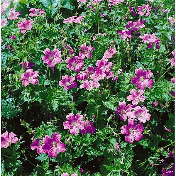 Geranium x oxonianum ‘Claridge Druce’, der bewährte Storchschnabel, ist eine robuste Gartenstaude, die mit natürlicher Leichtigkeit Beete und Rabatten belebt. Die zart rosa bis purpurrosafarbenen Blüten mit feiner Aderung erscheinen reich von Mai bis in den Sommer und setzen über viele Wochen lebendige Akzente. Das frischgrüne, tief gelappte Laub bildet einen dichten, buschigen Horst und kann in milden Lagen halbimmergrün bleiben. Mit einer Höhe von etwa 40 bis 50 cm wächst diese Staude kompakt bis locker überhängend und eignet sich als flächiger Bodendecker ebenso wie als charmante Beetstaude im Bauerngarten. Als Begleitpflanze zu Rosen, im Staudenbeet, im Vorgarten oder zur Unterpflanzung von Gehölzen fügt sich der Zierstauden-Klassiker harmonisch ein; auch im Kübel auf Terrasse und Balkon zeigt er sich als zuverlässige Kübelpflanze. Ein sonniger bis halbschattiger Standort fördert eine üppige Blüte, doch auch lichter Schatten wird gut vertragen. Der Boden sollte humos, durchlässig und mäßig frisch sein; Staunässe vermeiden. Ein Rückschnitt nach der ersten Blüte regt eine weitere Blühwelle an und hält den Gartenstrauch-Charakter dieser Staude kompakt und vital. Alle paar Jahre kann eine Teilung zur Verjüngung erfolgen. ‘Claridge Druce’ ist pflegeleicht, anpassungsfähig und erfreut mit natürlichem Wuchswillen in Gruppenpflanzungen wie auch als zurückhaltender Solitär, der Übergänge zwischen Wegen, Steinen und Pflanzflächen weich modelliert und dauerhaft ordnet.