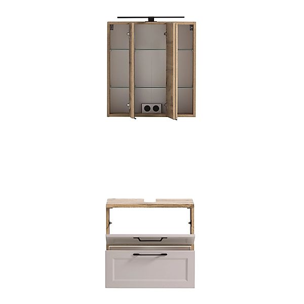 Das Held Möbel 2-tlg. Unterbeckenschrank-Set der Serie Padua besticht durch sein formvollendetes Design und seiner hochwertigen Verarbeitung. Dank der Farbgestaltung in Kaschmir/Wotaneiche passen sich die Badezimmerschränke spielend leicht an bestehende Badezimmereinrichtungen an. Der 60 cm breite Unterbeckenschrank sorgt mit seinem Auszug inklusive Softclose-Funktion für Flexibilität bei der Innenraumnutzung. Der obere Bereich ist mit einem Klappmechanismus ausgestattet und bietet zusätzlichen Stauraum. Mit seiner Höhe von 54 cm bietet der Unterbeckenschrank Padua genügend Platz für Ihre Badezimmerartikel, Hygiene- und Pflegeprodukte. Der 60 cm breite Spiegelschrank sorgt mit einer schwarzen LED-Aufbauleuchte inklusive Schalter und Steckdose für Flexibilität bei der Innenraumnutzung. Mit seiner Höhe von 64 cm bietet der 3D-Spiegelschrank Padua genügend Platz für Ihre Badezimmerartikel, Hygiene- und Pflegeprodukte. Die moderne Landhaus-Interpretation mit schwarzen Akzenten unterstreicht das elegante und modische Erscheinungsbild Ihres Badezimmers. Das Set beeindruckt nicht nur durch Design und Größe, sondern auch durch seine hervorragende Qualität. Durch die hochwertigen folienbeschichteten MDF-Fronten in Kombination mit melaminharzbeschichteten Korpus-Platten, lässt sich das Set einfach und mühelos reinigen. Maße: B/H/T: ca. 60/200/35 cm Weitere Informationen: Spiegelschrank und Unterbeckenschrank inklusive Aufbauanleitung, LED-Aufbauleuchten, Montagematerial enthalten