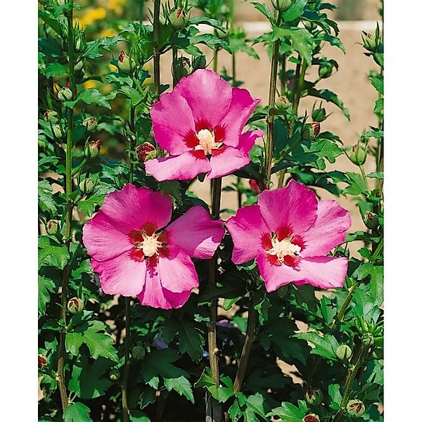 Hibiscus syriacus Maike, der Gartenhibiskus Maike, ist ein eleganter Blütenstrauch, der mit seinen zarten, halbgefüllten Blüten in softem Rosa und einem karmesinroten Basalfleck sofort ins Auge fällt. Von Juli bis September öffnet dieser Zierstrauch fortlaufend neue Knospen und verwandelt den Garten in eine spätsommerliche Blütenbühne. Das frischgrüne, leicht gelappte Laub unterstreicht die üppige Blütenpracht, im Herbst zeigt der Gartenhibiskus eine dezente, gelbliche Färbung. Der Wuchs ist aufrecht bis leicht vasenförmig, gut verzweigt und formschön, wodurch sich Maike sowohl als attraktiver Solitär als auch in Gruppenpflanzungen bestens einsetzen lässt. Ob im Staudenbeet, im Vorgarten, entlang eines Weges oder als lockere Heckenpflanze – dieser Gartenstrauch bringt Struktur und Farbe in sonnige bis halbschattige Bereiche. Als Kübelpflanze auf Terrasse oder Balkon zeigt er seine Stärken ebenso zuverlässig, solange der Topf einen durchlässigen, humosen und nährstoffreichen Substratmix bietet. Ein warmer, geschützter Standort fördert die Blütenfülle, Staunässe sollte vermieden werden, da Hibiscus syriacus lockere, gut drainierte Böden bevorzugt. Eine maßvolle Frühjahrsdüngung und gelegentliche Wassergaben in Trockenphasen unterstützen Vitalität und Knospenreichtum. Ein Rückschnitt Ende Winter oder sehr zeitig im Frühjahr hält den Blütenstrauch kompakt und regt die Bildung junger, blühfreudiger Triebe an. In Kombination mit sommerblühenden Stauden, Gräsern oder niedrigen Gehölzen entsteht ein harmonisches Bild, das Beete, Terrassen und Eingangsbereiche über viele Jahre wirkungsvoll bereichert.