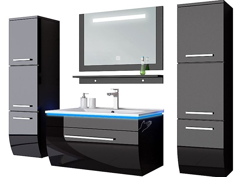 ***** Badmöbel Set Danny Komplett 6 Teilig Schwarz ***** Sofort lieferbar Waschbecken – Unterschrank ist vormontiert Voll lackiert Softclose LED Material: MDF Holz Oberfläche Voll Lackiert inkl. Seitenteile! Farbe: Schwarz Becken Aus Keramik LED Beleuchtung Ja im Spiegel und Blau im Waschbeckenunterschrank Licht Steurung Per Touch sensor Hochwertiges Designer Badmöbel Set in Schwarz Traumhafte Badmöbel-Sets Strahlt Komplett Hochglanz Fronten Und Seiten. Bequem fertig aufgebaut nach Hause liefern lassen. Gönnen Sie sich den kleinen Luxus... Was heißt, montiert geliefert? Montiert geliefert heißt, dass der Waschtischunterschrank mit allem teilem und Türen komplett vorab werksseitig montiert wird. Bestellung enthalten sind. Zu Ihnen nach Hause macht sich dann eine fertiges Möbelstück auf den Weg, sicher und gut für den Versand verpackt. Sie müssen den Möbelwaschtisch und gegebenenfalls den Spiegel- und Badschrank nur noch an die Wand hängen. Badmöbelset 6 Teilig Hochglanz Lackiert Fronten und Seiten Schwarz. Unsere Badmöbel werden nicht aus gewöhnlicher Spanplatte hergestellt sondern aus langlebigen MDF Holz. Unsere Produkte sind aus Qualitätsgründen nicht Foliert sondern Lackiert. Eine Folierung ist in feuchten Räumen einfach nicht langlebig, da sich Folierungen schnell lösen. Unsere Badschränke sind mit Softclose ausgestattet, Ein schubser genügt und die Türen Vom Hochschrank schliessen wie von selbst, und das leise. Um das LED-Licht beim Unterschrank an und aus zu schalten, streichen Sie einfach mit der Hand über die rechte Seite. Das LED Licht beim Spiegel wird ebenfalls durch eine einfache Berührung an und aus geschlatet. Unsere Badmöbel schauen nicht nur toll aus, sie sind dank der LED Beleuchtung auch sehr stromsparend. Was ist eigendlich MDF-Holz? MDF ist die Abkürzung für die Mitteldichtefaserplatte. Vom Prinzip her ähnelt sie der Spanplatte. Auch hier wurden Holzbestandteile zu einer Platte zusammengeleimt. Der Unterschied zwischen Spanplatten und MDF-Platten liegt lediglich darin, dass bei MDF-Platten keine Holzspäne, sondern feinstzerfasertes Holz zu einer Platte zusammengeleimt und gepresst wurde. Dadurch verfügen diese Platten über eine besonders hohe Bruch- und Biegefestigkeit. MDF-Platten sind meist kunststoffbeschichtet oder furniert, können aber auch mit anderen Beschichtungen versehen sein. Bei unseren Badmöbeln ist die Oberfläche aus Qualitätsgründen Lackiert. Vorteile von Keramik Waschtisch Naturprodukten. Ohne chemische Substanzen Langlebig Hygienisch Kratzfest individuelle Maserung, Format und Farbe LIEFERUMFANG Folgendes ist in diesem Badmöbel Set enthalten 1x Waschtischunterschrank 1x Keramik Waschbecken 60 cm 1x Spiegel cm und Lichtschalter ( Touch ) 60 cm 1x Spiegel ablage 60 cm 1x Led Beim Waschbecken Unterschrank 1x Licht Beim Spiegel 2x Hochschrak 110x30x30