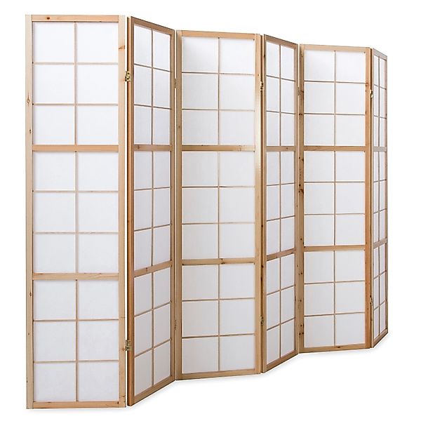 Der Paravent erzeugt durch seine idyllische Optik eine Wohlfühlatmosphäre in jedem Wohnbereich. Das Flair des Raumteilers kann aufgrund der beidseitigen Bespannung rundum wirken. Geschmackvolle Holzstreben verzieren zusätzlich den Innenbereich des Paravents. Das Produkt ist nicht nur ein optisches Highlight, sondern hat als Sichtschutz und Raumtrenner auch eine funktionelle Wirkung. Durch Scharniere, die in beide Richtungen klappbar sind, kann der Paravent sehr leicht genau nach Ihren individuellen Wünschen in den Wohnbereich integriert werden. Sollte er einmal nicht werden, lässt er sich problemlos und platzsparend zusammenklappen. Produktdetails: 6-teiliger Paravent zusammenklappbar, leicht aufzustellen Scharniere in beide Richtungen drehbar Material und Farbe: Holz, klar lackiert weißes Shoji Reispapier Maße: Höhe: 175 cm Breite: 264 cm Tiefe: 2,2 cm Breite der einzelnen Elemente: 44 cm Lieferdetails: Produkt wird fertig montiert geliefert