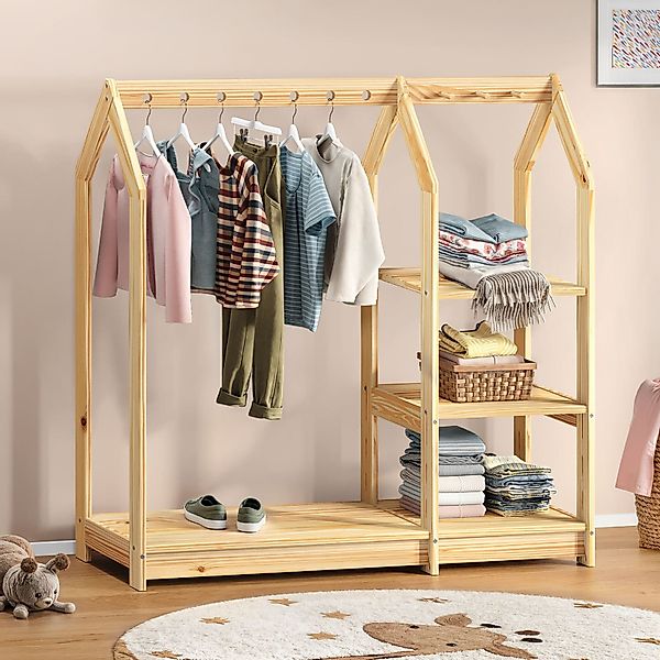 Kinder Kleiderständer Sally Unser Kinder Kleiderständer im verspielten Hausdesign bietet nicht nur praktische Ablagemöglichkeiten, sondern wird auch zum Hingucker im Kinderzimmer. Aus robustem Kiefernholz gefertigt, präsentiert sich die Kindergarderobe in einem schlichten Farbton. Dank der integrierten Kleiderstange und weiteren Aufhängemöglichkeiten lassen sich Kleidungsstücke übersichtlich ordnen. Zusätzlicher Stauraum wird durch Ablageböden und Kleiderhaken geboten. Materialbeschreibung: Gestell aus Kiefer-Massivholz, natur lackiert Ausstattung: Aufbau nach Montessori zur Förderung der Selbständigkeit7 Kleiderbügellöcher4 Ablageböden3 Kleiderhaken Versand &, Montage: Lieferumfang: 1x KleiderständerArtikel wird zerlegt geliefertKundenfreundliche Montage mit AnleitungLieferung per PaketdienstLieferung ohne Dekoration Zusammenfassung: - Farbe: natur - Material: Kiefer massiv - Aufbaumaße: 120 x 118 x 42 cm (B x H x T) - Anzahl Kleiderhaken: 3 - Oberfläche: Lackiert - Schuhablage: Ja