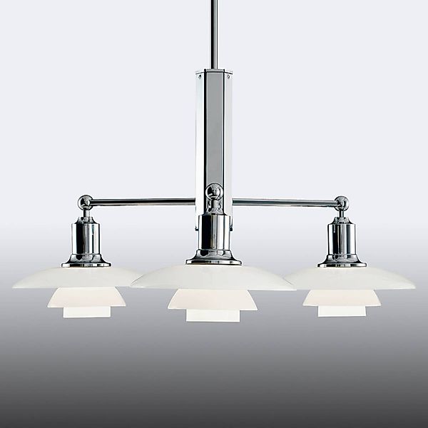 Pendelleuchte PH 2/1 Stammkrone mit Schirmen aus dreischichtigem Opalglas Das Prinzip der dreiflammigen Pendelleuchte PH 2/1 Stammkrone geht zurück auf die Jahre 1925/26, als Poul Henningsen, dänischer Designer, Architekt, Schriftsteller und Journalist, den dreiteiligen Leuchtenschirm entwarf. Schon die ersten Modelle entstanden unter Mithilfe von Louis Poulsen. Es sollte eine lebenslange Zusammenarbeit bis zum Tode von Poul Henningsen im Jahr 1967 werden. Henningsen war bestrebt, Leuchten mit blendfreiem Licht zu kreieren, die weiche Schatten werfen und neben einer optimalen Ausleuchtung auch ein fantastisches Ambiente bewirken. Waren die ersten Schirme noch aus Metall gefertigt und innen weiß, gold oder silberfarben lackiert, so bestehen die Schirme der PH 2/1 Stammkrone aus mundgeblasenem, dreischichtigem Opalglas, das außen glänzt und auf der Innenseite matt sandgestrahlt ist, was eine weiche, diffuse Lichtverteilung bewirkt. Die Leuchtenarme und der Gestell sind aus Messing gearbeitet und wurden hochglanzverchromt. Die Fassungsabdeckungen bestehen aus gezogenem, ebenfalls hochglanzverchromtem Aluminium. Die Pionierarbeit des Designers Poul Henningsen in Bezug auf die Relationen zwischen Lichtstrukturen, Schatten, Spiegelung und Lichtwiedergabe - verglichen mit dem menschlichen Bedürfnis nach Licht, gerade in der dunklen Jahreszeit -, ist nach wie vor der Grundstein der bei Louis Poulsen eingesetzten Lichttheorie.