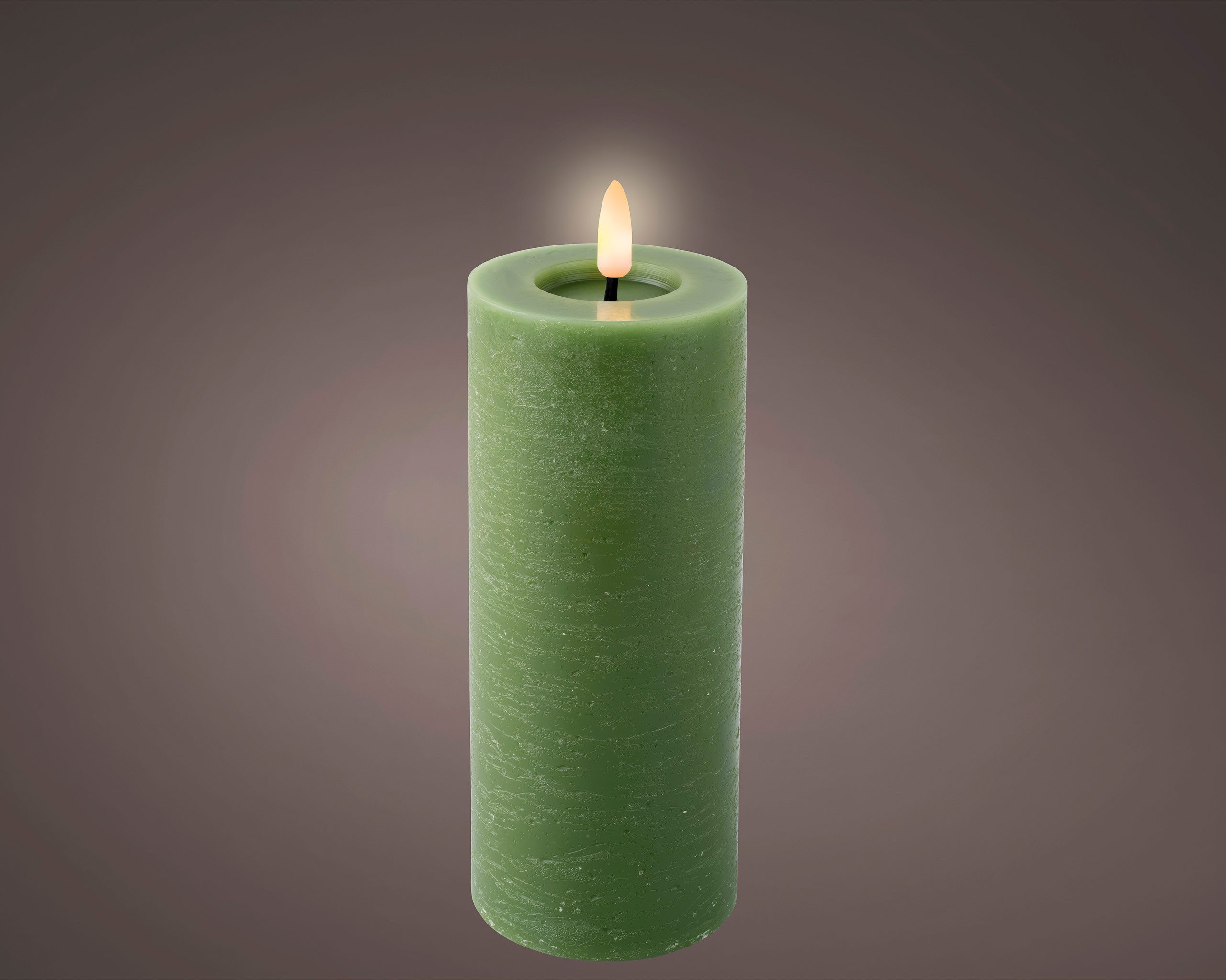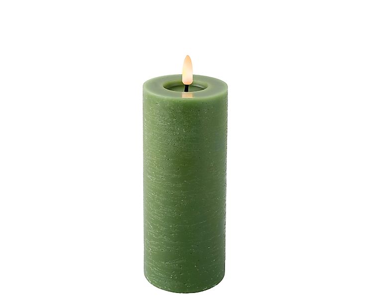 Elektrische Kerzen / Kerzen mit Batterie Betrieb / LED Kerzen mit Timer / LED Stumpenkerze Rustik Material: Wachs - Größe (DxH): ca. 7 x 19 cm - Inhalt: 1 Dekokerze - Farbe: grün Technische Daten: Beleuchtung: 3mm LED-Licht in warm weiß - Funktionen: Dauerlicht und 6 Stunden Timer - Batterietyp: 2x AAA-Batterien (nicht enthalten) - Betriebszeit: ca. 250 Stunden - Produkt IP-Klasse: IP-20 - Gütezeichen: CE, UKCA - flammenlose Kunstkerze, batteriebetrieben mit Timerfunktion, für den Innenbereich - aus echtem Wachs, täuschend realistisch mit flackernde Flamme Effekt - keine Rauchentwicklung oder Brandgefahr durch offenes Feuer, ideal für Familien mit Kindern oder Haustieren Diese besondere Kerzendeko bringt stimmungsvolles Ambiente in Ihr Zuhause. Unsere LED-Echtwachskerze mit flackerndem Kerzenschein ist kaum von normalen Wachskerzen zu unterscheiden. Ohne offene Flamme ist die künstliche Kerze auch eine sichere sowie langlebige Alternative dazu und lässt sich bedenkenlos im gesamten Haus verwenden. Bei aktiviertem Timer wird die LED-Zylinderkerze automatisch einmal am Tag für 6 Stunden zum Leuchten gebracht. Ob als Laternenkerze für laue Sommernächte oder Kaminkerze an kalten Winterabenden, unsere Blockkerze sorgt das ganze Jahr über für gemütliche Atmosphäre. Auch zur festlichen Dekoration ist die einfarbige Tischkerze ideal geeignet, z. B. als Weihnachtskerze bzw. Adventskerze zur Weihnachtsdekoration oder Altarkerze für die Hochzeitsdekoration. Mit ihrem angenehmen Kerzenlicht verleiht die Tischdeko Ihrer Geburtstagsdeko, Hochzeitsdeko, Weihnachtsdeko, Osterdeko oder Partydeko eine elegante und feierliche Note. Anlässe & Saison: Frühling, Ostern, Sommer, Valentinstag, Verlobung, Hochzeit, Trauung, Taufe, Erstkommunion, Kommunion & Konfirmation, Firmung, Geburtstag, Kindergeburtstag, Jubiläum, Herbst, Winter, Advent, Weihnachten - Stil & Aufmachung: uni & einfarbig, rustikal, Rustik / Rustic