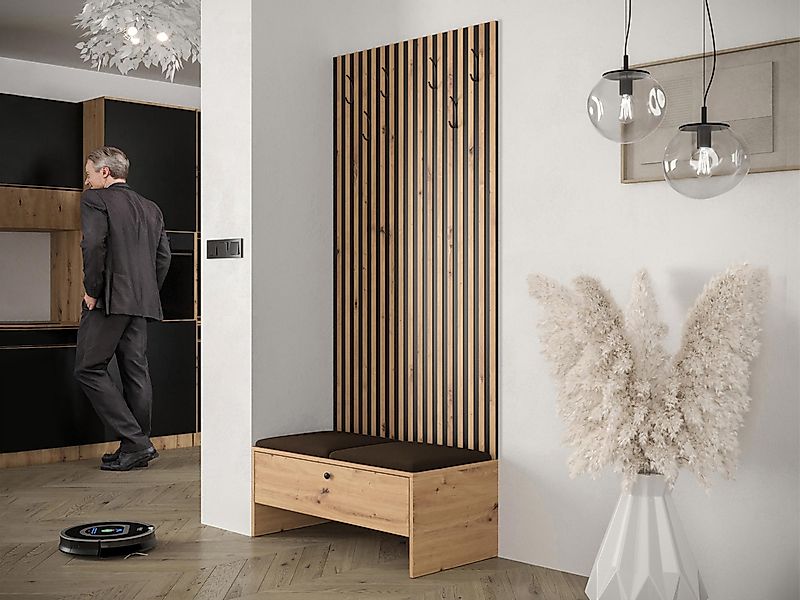 Garderoben-Set Balma IV Maße: Unterschrank mit Lamellen: - Breite: 85 cm, Höhe: 206 cm, Tiefe: 44 cm. Gepolstertes Paneel Pag 42x42 x 2 Stück: - Breite: 42 cm, Höhe: 42 cm, Tiefe: 4 cm. Alle Maße sind ca. Maße. Lieferung: Die Möbel werden in Paketen mit Montageanleitung zum Selbstaufbau bis zur ersten Tür geliefert.Geliefert wird nicht auf Insel und Bergbewohnung. Farbkombination: Die Farben unserer Grafik können vom Original abweichen. Ausführung: Laminatplatte 16 mm,Rand PVC,Rücken des Möbelstückes aus HDF-Platte,Metall griffe,Haken aus Kunstoff,Wandbefestigung für Lamellen-Paneel ist nicht im Set enthalten,Die Elemente werden mit Exzenterverbindern verbunde.Gepolstertes Paneel: Material: Die Basis besteht aus Spanplatte MDF +, Schaumstoff +, Stoff,Montagemethode: mit Klebstoff, Klettverschluss oder Montageschaum (Diese Accessoires sind nicht im Set enthalten. Der Kunde muss diese selbständig erwerben),Form: Quadrat,3D-Effekt,Anwendung: In Innenräumen. Zusatzinformation: ohne Dekoration.