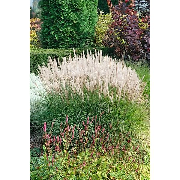 Miscanthus sinensis ‘Sarabande’, das elegante Chinaschilf, ist ein kompaktes Ziergras, das als attraktive Gartenstaude mit filigraner Ausstrahlung überzeugt. Die schmalen, leicht überhängenden Blätter mit feiner Mittelrippe bilden dichte Horste und zeigen im Jahresverlauf ein lebendiges Spiel aus frischem Grün bis hin zu warmen Herbsttönen. Ab Spätsommer erscheinen zarte, anfangs rötlich schimmernde, später silbrig aufhellende Rispen, die dem Blütenstand eine luftige Leichtigkeit verleihen und den Zierwert bis in den Winter hinein verlängern. Mit einer Höhe von etwa 120 bis 150 cm bleibt ‘Sarabande’ wohltuend maßvoll und passt hervorragend in kleinere Gärten, in die Staudenrabatte oder den Präriegarten. Dieses Chinaschilf eignet sich gleichermaßen als Solitär im Vorgarten, in Gruppenpflanzung als strukturgebender Gartenstrauch-Ersatz oder als lockerer, natürlicher Sichtschutz. In großzügigen Beeten setzt es Akzente zwischen spätblühenden Stauden und bildet zusammen mit Blütensträuchern einen harmonischen Übergang. Als Kübelpflanze auf Terrasse und Balkon kommt die anmutige Silhouette besonders zur Geltung, sofern das Gefäß ausreichend groß ist und der Wasserabzug stimmt. Ein sonniger Standort fördert kompakte Horste und reiche Blütenbildung. Der Boden sollte durchlässig, humos bis sandig-lehmig und gleichmäßig frisch sein; Staunässe wird nicht vertragen. Nach dem Winter reicht ein Rückschnitt der trockenen Halme knapp über dem Boden, anschließend treibt die Staude vital neu aus. Eine moderate Nährstoffversorgung im Frühjahr und gelegentliches Wässern in Trockenphasen unterstützen den dichten Wuchs und die standfeste, aufrechte Form. So bleibt Miscanthus sinensis ‘Sarabande’ ein pflegeleichtes Ziergras mit hohem gestalterischem Wert.
