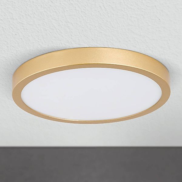 Vika - gold matt lackierte LED-Deckenleuchte Die LED-Deckenleuchte Vika überzeugt in erster Linie durch ihre sehr flache Bauweise - gerade einmal 2,4 cm misst sie in der Höhe. Darüber hinaus ist sie ein sehr flexibel einsetzbarer Lichtspender, denn sie kann zum einen in den verschiedensten Räumlichkeiten eingesetzt und zum anderen mit zahlreichen Stilrichtungen kombiniert werden. Das runde Gehäuse besteht aus robustem, in einem matten Goldton lackierten Aluminium. Die weiß satinierte Diffusorplatte bewirkt eine flächige Lichtstreuung, so dass sich Vika vorzugsweise zur Allgemeinbeleuchtung von Wohnräumen, wie zum Beispiel dem Flur oder dem Hobbyraum, anbietet. Die Leuchte eignet sich sowohl zur Decken- als auch zur Wandmontage, was ihre Flexibilität zusätzlich unterstreicht. Montageteile und Schrauben sind von außen nicht sichtbar!