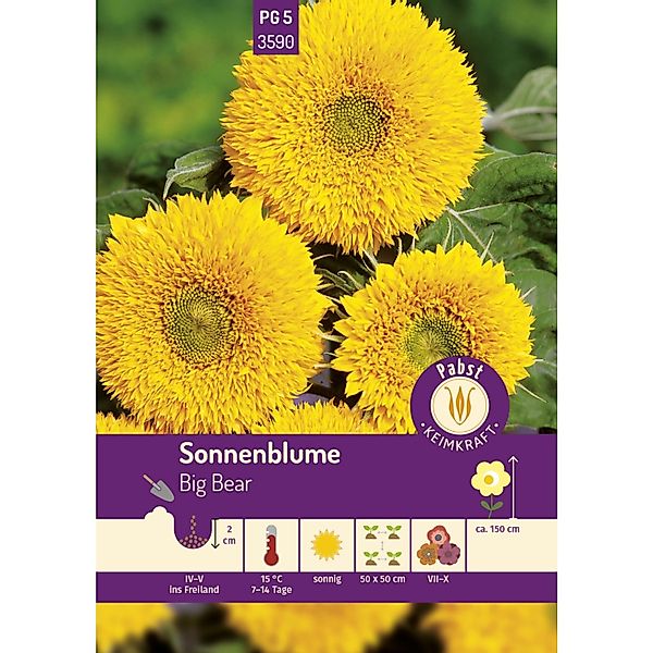 Diese einjährige, unverzweigte Sonnenblume besitzt dichtgefüllte, strahlend gelbe Blüten. Sie wirkt besonders in Gruppen angepflanzt vor Mauern und Zäunen und eignet sich sehr gut zum Schnitt für die Vase. Aussaat: April bis Mai. Kultur: Keimung 7-14 Tage bei 15 °C, je 1 Korn in Töpfe oder 2-3 Samen je Horst im Abstand 50x50 cm legen, Saattiefe ca. 2 cm, stärkste Pflanze stehen lassen. Standort: Sonnig, nährstoffreicher Boden, keine Staunässe. Blüte/Ernte: Juli bis Oktober. Inhalt: reicht für ca. 20 Pflanzen
