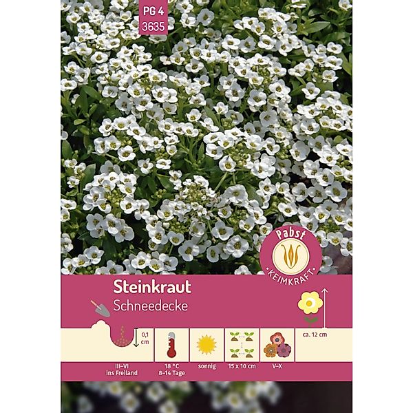 Einjährige Polsterpflanzen, deren dichtes, langanhaltendes Blütenmeer tatsächlich an einen Schneeteppich erinnert. Die beliebten und genügsamen Sommerblumen für Beet, Steingarten, Einfassungen und Balkonkästen sollten in Gruppen gepflanzt werden und sind mit ihrem intensiven Duft auch für Bienen sehr verlockend. Aussaat: März bis Juni. Kultur: Keimung 8-14 Tage bei 18 °C, Saattiefe 0,1 cm, breitwürfige Direktsaat, einharken, feucht halten, auf 15x10 cm vereinzeln. Standort: Sonnig, magerer, sandiger, leicht kalkhaltiger Boden. Blüte/Ernte: Mai bis Oktober. Inhalt: reicht für ca. 250 Pflanzen