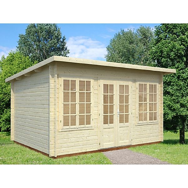 Das Palmako Holz-Gartenhaus Lisa mit einer Fläche von 11,5 m² besteht aus 34 mm Blockbohlen und bietet winddichte Chaletschnitt-Eckverbindung. Die stabile, teilverglaste Doppeltür mit Leimholzrahmen und Zylinderschloss verfügt über niedrige, mit Edelstahl abgedeckte Türschwelle. Zwei nach Außen öffnende Doppelfenster und die Doppeltür haben 4 mm Einzelverglasung und aufgesetzte Sprossen. Zum Bausatz gehören auch imprägnierte Fundamenthölzer, 19 mm Dach- und Fußbodenbretter mit Nut und Feder, Sturmleisten, sowie Montage-Set. Die Dacheindeckung ist nicht im Lieferumfang enthalten. Ab Werk wird das Haus mit einer farbigen Fassade im Grundfarbton hellgrau RAL7042 sowie der Akzentfarbe weiß RAL9016 versehen. Das Innere des Hauses bleibt naturbelassen.