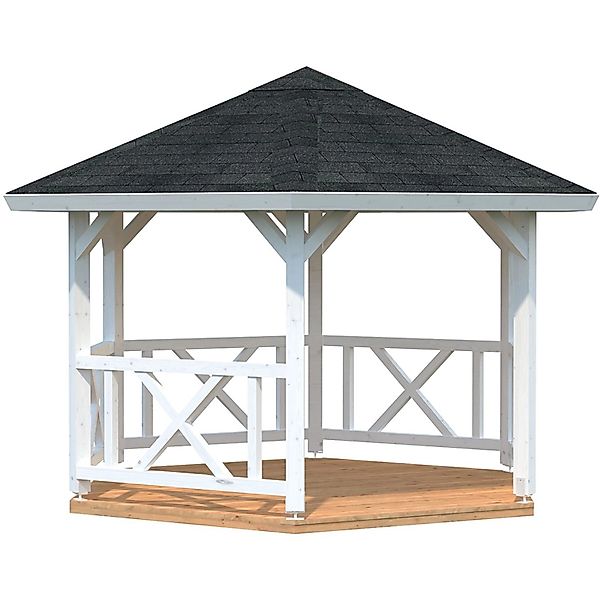 Der Palmako Garten Pavillon Betty 9,9 m² schafft ein neues romantisches Plätzchen in Ihrem Garten und lädt dazu ein, sich bei großer Hitze im Schatten gutgehen zu lassen. Der sechseckige Pavillon wird aus massiven, naturbelassenen 120 mm x 120 mm Leimholzpfosten gefertigt. Der stabile Aufbau wird durch professionell ausgeklinkte Dachsparren sowie ein verzapftes Geländer ergänzt. Exakt zugeschnitte Dachbretter erleichtern die Montage. Im Lieferumfang enthalten sind Metallpfostenträger, optional erhältlich sind ein passender Fußboden sowie Dachschindeln. Ab Werk wird der Pavillon im Farbton Weiss RAL9016 lackiert.