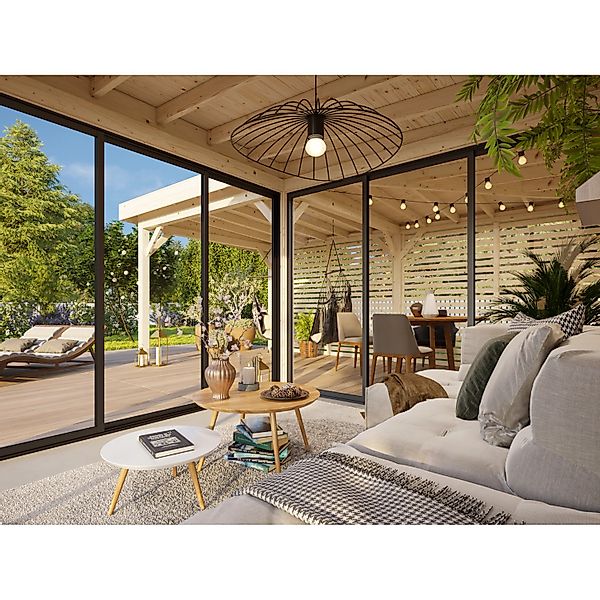 Das großzügige Palmako Pavillon Lenna Set 411 mit einer Fläche von 24,9 m² ist die perfekte Lösung für Ihre Outdoorküche. Neben dem dreiseitig verglasten Pavillon mit Alu-Schiebetüren bietet die überdachte Stellfäche ausreichend Platz für den Grill und die Gartenmöbel. Zwei geschlossene Wände sowie zwei Sichtschutzelemente geben Ihnen viel Spielraum zum Einrichten Ihrer individuellen Outdoorküche. Die Schiebetüren können in beide Richtungen geöffnet werden und sind mit einem PZ-Schloss ausgestattet. Massive Leimholzpfosten sowie 19 mm Dachbretter bilden die Basis. Ein Fußboden, Dacheindeckung und Regenrinne sind optional lieferbar. Der Pavillon wird aus nordischem Fichtenholz gefertigt und ab Werk im Farbton Weiß RAL9016 lackiert.