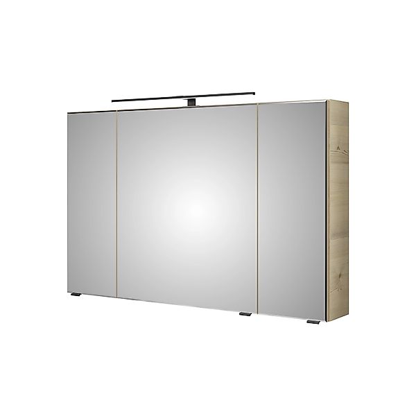 Verleihen Sie Ihrem Badezimmer modernen Glanz mit dem wohnlichen Polar-Pinie Quer NB Spiegelschrank. Ausgestattet mit einer integrierten LED-Aufsatzleuchte und einem Sensorschalter für den LEDplus-Farbtemperaturwechsel (3.000 K - 6.500 K) sorgt er für optimale Beleuchtung. Drei verspiegelte Drehtüren mit elegantem Facettenschliff sowie sechs Glaseinlegeböden bieten großzügigen Stauraum. Integrierte Schalter und Steckdose sowie stilvolle schwarze Griffe ergänzen das schlanke Design. Perfekt für ein funktionales und ästhetisches Ambiente in Ihrem Bad. Ausstattung - Inkl.Aufsatzleuchte Schwarz - 12 V LED - LM LED - 3,20 W - 458 LM - 3.000 K - 6.500 K - Inkl. Sensorschalter zur Steuerung von LEDplus Farbetemperaturwechsel - 3 Drehtüren einfach verspiegelt mit Facettenschliff - 6 Glaseinlegeböden - Schalter/Steckdose - Inkl. schwarzen Griffen