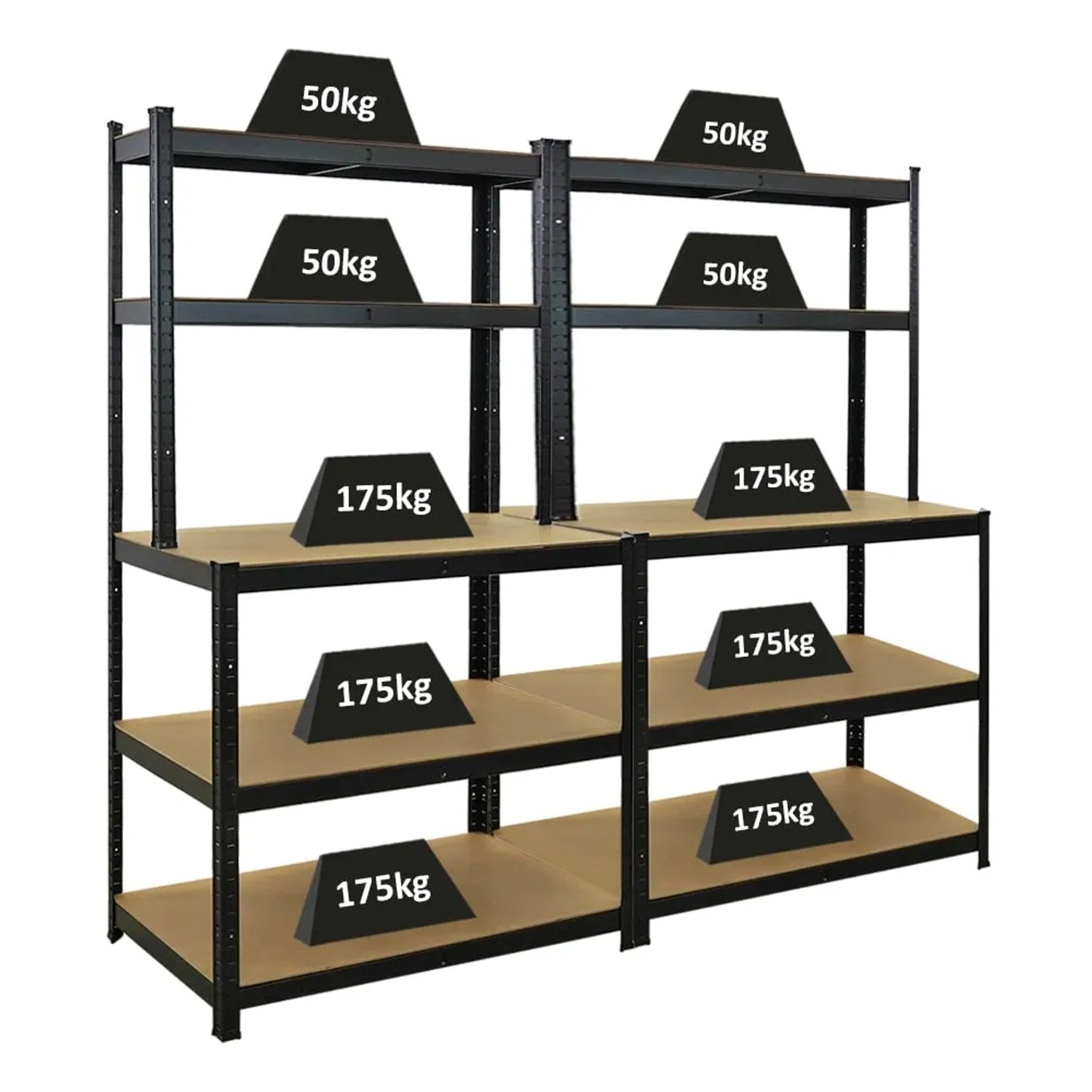 Mit der Profi Werkbank GIANT BEAST von PROREGAL besitzt DU die ideale Lösung für eine professionelle und anspruchsvolle Anwendung in Werkstätten oder Garagen. Mit einer Höhe von 180 cm, einer Breite von 100 cm und einer Tiefe von 60 cm bietet jete Profi Werkbank großzügigen Anwendungs- und Stauraum in kompakter Form. Jede Werkbank verfügt über 5 Fachböden aus hochwertigem MDF-Platten mit einer Bodenstärke von 5 mm, die dank des Höhenrasters in 2,5 cm Abständen höhenverstellbar sind. Die 3 unteren Ebenen mit einer Tiefe von jeweils 60 cm bieten großzügigen Stauraum für schwere Werkzeuge oder Materialien. Die beiden oberen Ebenen mit einer Tiefe von jeweils 30 cm sind ideal für kleinere Werkzeuge oder als zusätzliche Ablageflächen. Mithilfe von jeweils 1 Unterstrebe bietet die Werkbank eine Traglast von 175 kg für die unteren Fachböden und 50 kg für die oberen Fachböden. Die Werkbank ist mit robusten Kunststofffüßen ausgestattet, die für zusätzlichen Schutz des Fußbodens sorgen und gleichzeitig eine stabile Standfestigkeit gewährleisten. Das Metall ist pulverbeschichtet , um eine lange Lebensdauer sicherzustellen und entgratet, um unangenehme Schnittkanten zu beseitigen. Dank der Steckmontage mit dem Easy-Slide-System lässt sich das Regal schnell und einfach mit nur einem Gummihammer montieren.