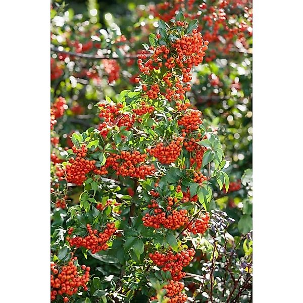 Pyracantha ‘Mohave’, der robuste Feuerdorn, ist ein immergrüner Zierstrauch (botanisch Pyracantha coccinea), der mit dichten, glänzend dunkelgrünen Blättern und stark bedornten Trieben als attraktiver Blütenstrauch und vielseitiger Gartenstrauch überzeugt. Im späten Frühjahr bis zum Frühsommer erscheinen zahlreiche weiße Blütendolden, die im Spätsommer zu auffallend leuchtenden, orange bis scharlachrot gefärbten Beeren ausreifen und bis in den Winter hinein für intensive Farbakzente sorgen. Der Wuchs ist aufrecht, sehr dicht und gut verzweigt, wodurch sich ‘Mohave’ ideal als Heckenpflanze für einen formstabilen Sichtschutz, als strukturgebender Solitär im Vorgarten oder für Gruppenpflanzungen im Beet eignet. Auch an einem Spalier an der Hauswand oder am Zaun lässt sich der Feuerdorn elegant führen; in großen Kübeln auf Terrasse und Hof entfaltet er ebenfalls seinen ganzjährigen Zierwert. Bevorzugt werden sonnige bis halbschattige Standorte mit durchlässigem, humosem und gern kalkverträglichem Boden, Staunässe wird nicht toleriert. Nach dem Anwachsen zeigt sich ‘Mohave’ erstaunlich trockenheitsverträglich und windfest, ist hervorragend winterhart und bewährt sich auch im Stadtklima. Die Schnittverträglichkeit ist hoch: Ein Formschnitt nach der Blüte oder im Spätwinter erhält die kompakte Silhouette und regt eine reiche Fruchtbildung an. Mit seiner Kombination aus immergrünem Laub, üppiger Blüte und intensiver Herbst- und Winterfärbung der Beeren ist Pyracantha ‘Mohave’ eine langlebige, pflegeleichte Wahl für strukturstarke Hecken, lebendige Gartenräume und stilvolle Akzente im Außenbereich.