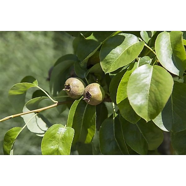 Pyrus communis ‘Decora’, die Zier- und Kultur-Birne, verbindet eleganten Blütenschmuck mit zuverlässiger Gartenleistung. Im Frühjahr öffnet der robuste Gartenbaum eine Fülle schneeweißer, leicht duftender Blüten, die vor dem frischen Austrieb erscheinen und das Gehölz in einen hellen Flor hüllen. Das sommergrüne Laub zeigt sich gesund, mittel- bis dunkelgrün und sorgt für eine dichte Krone mit aufrechter bis breitoval-pyramidalem Wuchs. Im Herbst leuchtet die Belaubung gelb bis gold, während die dekorativen, mittelgroßen Früchte von Spätsommer bis Herbst ausreifen und dem Ziergehölz zusätzlichen Reiz verleihen. Als Solitär im Vorgarten setzt diese Birne starke Akzente, eignet sich in der Obstwiese oder im lockeren Hofbereich als Gartenbaum und kann in größeren Gefäßen als Kübelpflanze auf Terrasse oder Innenhof kultiviert werden; in der lockeren Reihe oder am Spalier lässt sie sich auch als strukturgebendes Heckenelement führen. ‘Decora’ bevorzugt einen sonnigen bis halbschattigen Standort mit durchlässigem, humosem, mäßig frischem Boden; leichte Kalktoleranz und Windfestigkeit unterstreichen ihren robusten Charakter. Regelmäßige, aber maßvolle Wassergaben in Trockenphasen, eine jährliche Mulchschicht sowie ein formschonender Schnitt nach der Ernte oder im Spätwinter fördern Blühfreude und Kronenaufbau. Mit mittelstarkem Wachstum erreicht die Birne je nach Standortbedingungen eine Höhe von etwa 4 bis 6 Metern und bleibt dabei gut beherrschbar, wodurch sie sowohl in Einzelstellung als auch in Gruppenpflanzung eine vielseitige, langlebige Wahl für strukturierte Gartenräume darstellt.