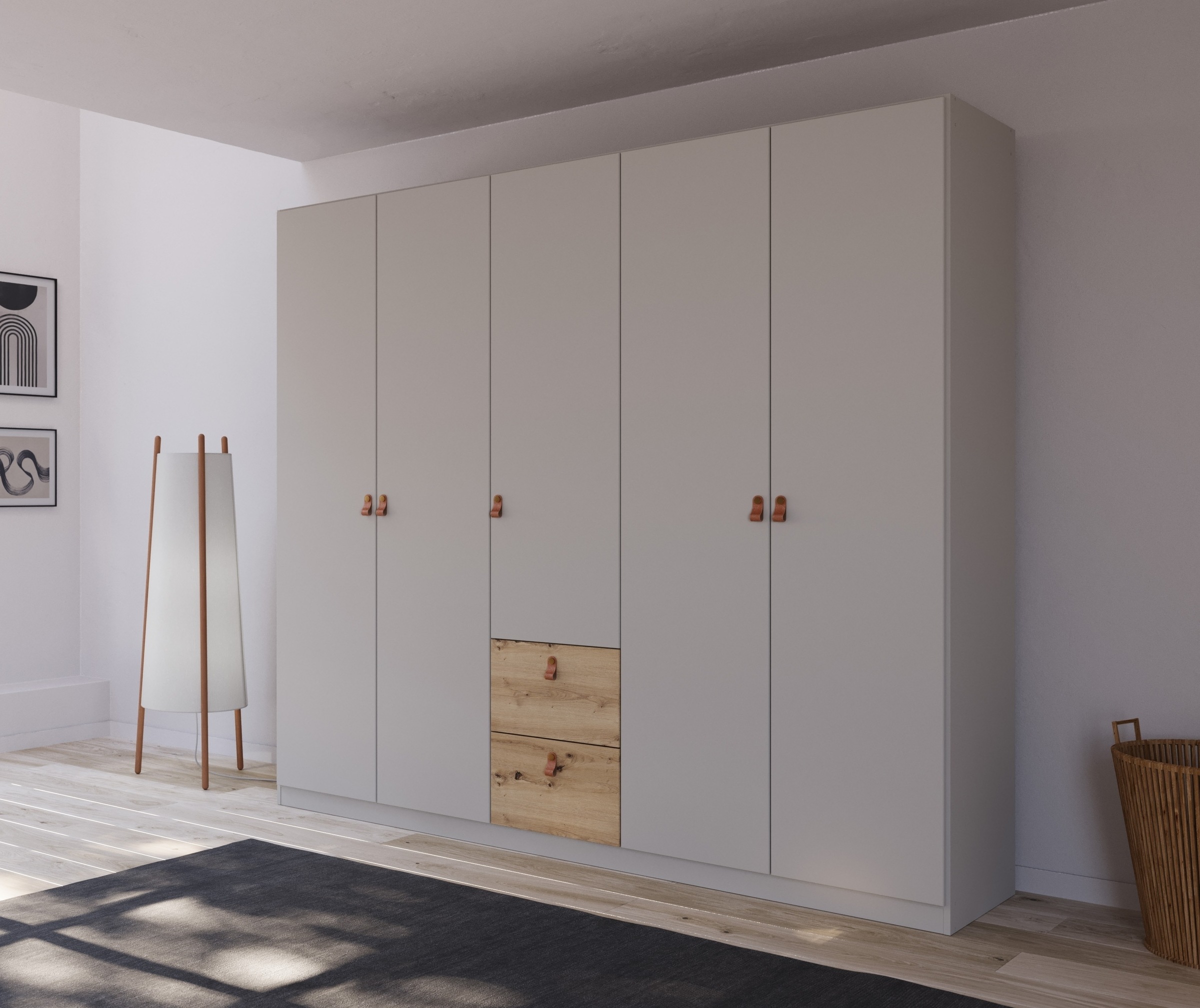 rauch Drehtürenschrank »Homey by Quadra Spin« mit cognacbraunen Ledergrifflaschen, Schubladen in Eichen-Dekor