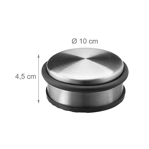 Der Türstopper ist ein nützlicher Helfer für Ihren Haushalt. Er verhindert das unbeabsichtigte An- und Zuschlagen von Türen. Sein Gewicht sorgt für einen festen Stand auf allen Böden. An der Unterseite des Türstoppers ist rutschfester Gummi angebracht, der die Standfestigkeit erhöht und das Wegrutschen verhindert. Er ist auf allen Fußböden einsetzbar. Der umlaufende Gummiring am Türfeststeller verhindert Beschädigungen an Ihren Türen und Möbeln. Für den Einsatz ist keine besondere Montage notwendig. Einfach an der gewünschten Stelle platzieren und Ihre Türen sind sicher. Dank seines eleganten Edelstahl-Designs passt er sich jeder Wohnung an und ist in allen Räumen einsetzbar.Wissenswertes zum Türpuffer• Maße gesamt H x B x T: ca. 4,5 x 10 x 10 cm• Material: Edelstahl, Gummi • Gewicht: ca. 1,2 kg • Umlaufender Gummiring• Unterseite komplett gummiertTürhalter als praktisches Wohnaccessoire• Schützt Türen, Böden und Wände vor Beschädigungen• Rundum-Schutz dank umlaufendem Gummiring• Rutschfest und schonend zum Untergrund• Frei im Raum positionierbar• Bewahrt Türen und Fenster vor dem ZuknallenLieferumfang• 4 x Türstopper• Dekorationsartikel sind nicht im Lieferumfang enthalten