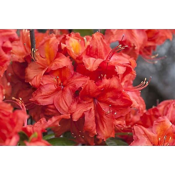 Rhododendron luteum Feuerwerk, die Gelb-Rote Duft-Azalee, präsentiert sich als ausdrucksstarker Blütenstrauch mit botanischem Charme und leuchtender Farbwirkung. Im späten Frühjahr öffnen sich trichterförmige, reich besetzte Blüten in warmem Gelb, akzentuiert von rötlichen Flammenzeichnungen – ein echtes Feuerwerk auf dem eleganten Laubgehölz. Das sommergrüne Blattwerk ist frischgrün, gesund und im Herbst oft eindrucksvoll orange- bis scharlachrot verfärbend, sodass der Zierstrauch über mehrere Jahreszeiten Attraktivität bietet. Der Wuchs ist aufrecht, dicht verzweigt und zugleich harmonisch aufgebaut, ideal als Solitär im Vorgarten, als Blickfang im Beet oder in einer lockeren Gruppenpflanzung mit anderen Moorbeetgehölzen. Auch im größeren Kübel auf Terrasse oder Balkon entfaltet dieser Gartenstrauch seine Wirkung, sofern ein passender, windgeschützter Standort gewählt wird. Am besten gedeiht Rhododendron luteum Feuerwerk in halbschattiger Lage mit Morgen- oder Abendsonne und humos-saurer, durchlässiger Rhododendronerde. Staunässe und kalkreiches Substrat sollten vermieden werden; eine gleichmäßig frische, gut mit organischem Material versetzte Bodenstruktur wirkt sich positiv auf Vitalität und Knospenansatz aus. Eine Mulchschicht hält die Feuchtigkeit und fördert das feine Wurzelwerk. Nach der Blüte können verwelkte Blütenstände vorsichtig ausgebrochen werden, um die Bildung neuer Knospen zu unterstützen; ein Schnitt ist nur leicht formierend nötig. In Kombination mit Farnen, Hosta, Heide oder anderen Azaleen entstehen harmonische Pflanzbilder, und als niedrige, naturnahe Blütenhecke setzt die Pflanze stimmungsvolle Farbakzente im Gartenjahr.