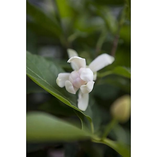 Sinocalycanthus × raulstonii ‘Venus’, bekannt als Duft-Gewürzstrauch oder Sommergewürzstrauch, vereint exotische Blütenpracht mit betörendem Aroma und ist als Blütenstrauch ein Highlight für anspruchsvolle Gärten. Die außergewöhnlichen, lotusartigen Blüten erscheinen ab Mai bis Juni in üppiger Fülle, sind außen strahlend weiß und zeigen im Zentrum attraktive purpurrote Akzente; mitunter folgt im Spätsommer eine Nachblüte. Das sommergrüne Laub ist groß, glänzend und frischgrün, im Herbst leuchtet es gelblich, wodurch der Zierstrauch auch außerhalb der Blütezeit Wirkung entfaltet. Der Wuchs ist aufrecht-buschig, gut verzweigt und dicht, ideal als Solitär im Vorgarten, als edler Gartenstrauch im Staudenbeet oder in der lockeren Gruppenpflanzung; in einem großen Kübel auf Terrasse oder Patio setzt die Kübelpflanze duftende Akzente in Sitzplatznähe. ‘Venus’ bevorzugt einen sonnigen bis halbschattigen, warmen und geschützten Standort sowie einen humosen, nährstoffreichen, gleichmäßig frischen, gut durchlässigen Boden ohne Staunässe; leicht saure bis neutrale Substrate werden bestens vertragen. Eine Mulchschicht hält die Feuchtigkeit, während eine maßvolle Frühjahrsdüngung den Austrieb unterstützt. Schnittmaßnahmen sind kaum nötig und erfolgen, falls gewünscht, unmittelbar nach der Blüte, um die elegante Wuchsform zu erhalten. In rauen Lagen empfiehlt sich Winterschutz im Kübel, im Freiland erweist sich das Gehölz als zuverlässig und robust. Als dekorativer Blütenstrauch, Solitär oder Teil einer lockeren Blütenhecke setzt Sinocalycanthus ‘Venus’ exklusive, duftende Akzente und verleiht dem Garten ganzjährig besondere Ausstrahlung.