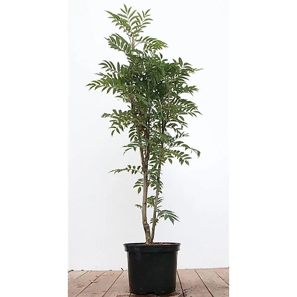 Sorbus aucuparia ‘Autumn Spire’, die schmal wachsende Eberesche, ist ein eleganter Zierbaum für moderne Gärten und kleine Flächen. Der kompakte Säulenwuchs bildet eine aufrechte, platzsparende Silhouette, die sich harmonisch in Vorgarten, Innenhof oder als Solitär im Beet einfügt. Im späten Frühjahr schmücken zahlreiche, cremeweiße Blütendolden das Ziergehölz und setzen helle Akzente vor dem frischgrünen, gefiederten Laub. Im Sommer reifen auffällige, orange- bis scharlachrote Fruchtstände, die den Gartenbaum dekorativ begleiten, bevor das Laub im Herbst mit intensiver Gelb-, Orange- und Rotfärbung einen eindrucksvollen Abschluss liefert. Als schmaler Kleinbaum eignet sich ‘Autumn Spire’ hervorragend für die Kübelpflanzung auf Terrasse und Balkon, als markanter Solitär im Rasen oder zur strukturierten Gruppenpflanzung entlang von Wegen und Einfahrten. Der Blütenbaum bevorzugt sonnige bis halbschattige Standorte und kommt mit normalem, durchlässigem Gartenboden gut zurecht; leicht saure bis schwach neutrale Substrate fördern Vitalität und Färbung. Staunässe sollte vermieden werden, während eine gleichmäßige Wasserversorgung in der Anwachsphase hilfreich ist. Der Pflegeaufwand bleibt gering: Ein behutsamer Erziehungsschnitt zur Erhaltung der schlanken Krone genügt, stärkere Rückschnitte sind selten nötig. Dank seiner robusten Natur, der klaren Säulenform und der saisonalen Highlights ist Sorbus aucuparia ‘Autumn Spire’ ein vielseitiges Ziergehölz für den zeitgemäßen Garten, das als Gartenstrauch im lockeren Pflanzbild ebenso überzeugt wie als strukturgebender Zierbaum im urbanen Umfeld.