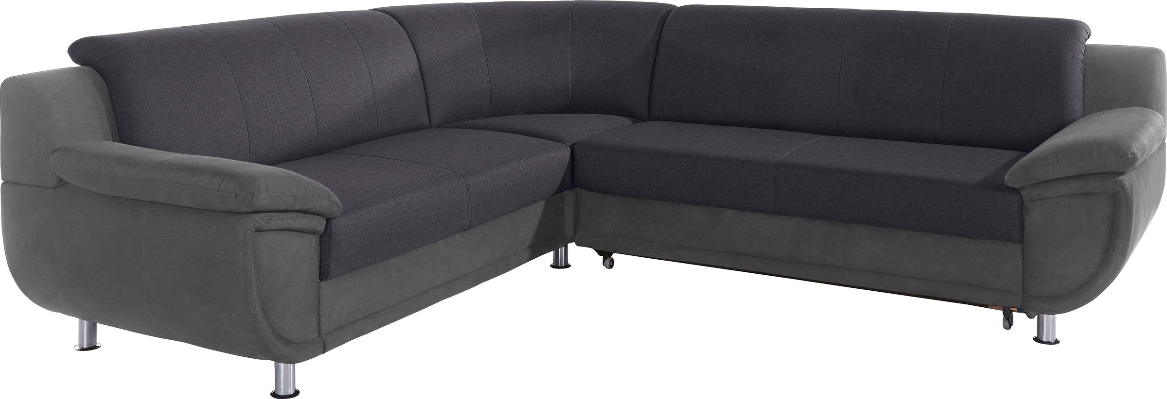 Mit dieser modernen Polsterecke wahlweise mit Bettfunktion werden Wohlfühlmomente in jedem Zuhause geschaffen. Die geschmackvolle Eckcouch überzeugt durch ihre hochwertige Verarbeitung aus FSC®-zertifiziertem Holzwerkstoff und ihrem schickem Design. Sie kann wunderbar zu verschiedenen Wohnstilen kombiniert werden und unterstützt ein stilvolles Gesamtbild. Für einen besonders angenehmen Sitzkomfort sorgen sowohl die atmungsaktive Polsterung als auch der wahlweise bestellbare, komfortable Federkern. Außerdem kann das tolle Ecksofa ganz einfach zu einem bequemen Bett umfunktioniert werden und bietet damit einen gemütlichen Schlafplatz auch für Gäste. Kombiniert Funktionalität mit Stil: die Polsterecke mit Bettfunktion., Ausstattung & Funktionen: Stellvariante: langer Schenkel rechts, Art Polsterung: Straffe,feste Polsterung, Polsteraufbau: Federkern, Polyätherschaum-Polsterung, Wellenunterfederung, Art Sitzkissen: fest, Art Rückenkissen: fest, Anzahl Füße: 8 Stk., Raumgewicht: 30 kg/m³, Anzahl Sitzflächen: 4 Stk., Anzahl Armlehnen: 2, Maßangaben: Breite: 267 cm, Tiefe: 247 cm, Höhe: 85 cm, Sitzhöhe: 46 cm, Breite Sitzfläche: 197 cm, Tiefe Sitzfläche: 56 cm, Breite Armlehnen: 35 cm, Tiefe Armlehnen: 60 cm, Höhe Armlehnen: 68 cm, Breite Liegefläche: 197 cm, Länge Liegefläche: 118 cm, Höhe Füße: 10 cm, Bodenfreiheit: 10 cm, Tiefe Hauptelement: 94 cm, Gewicht: 132 kg, Belastbarkeit pro Sitzplatz: 120 kg, Hinweis Maßangaben: Alle Angaben sind ca.-Maße., Material: Bezug: Luxus-Microfaser ALCAZAR, Struktur fein, Bezug Korpus: Luxus-Microfaser ALCAZAR®, Bezug Sitzfläche: Struktur fein, Abriebfestigkeit Bezug: 5 (sehr gut), Pillingbildung Bezug: 5 (sehr gering), Material Untergestell: Holz teilmassiv, Material Füße: Metall, Information Materialzusammensetzung: Luxus-Microfaser ALCAZAR®, Struktur fein, Kunstleder SOFTLUX® / Struktur (77 % Polyester, 23 % Polyacryl), Scheuerbeständigkeit Bezug: 85.000 Scheuertouren, Farbe: Farbbezeichnung: grau/dunkelgrau, Farbe Korpus: grau, Farbe Sitzfläche: dunkelgrau, Farbe Füße: chromfarben, Allgemein: Ausführung: Mit Federkern, mit Bettfunktion, Lieferung & Montage: Aufbauhinweise: einfache Selbstmontage mit Aufbauanleitung, Lieferzustand: teilmontiert, nur einhaken und Füße montieren, Hinweis Lieferumfang: ohne Zierkissen, Hinweise: Pflegehinweise Bezug: Bitte die Pflegehinweise gemäß unserem beiliegenden Produkt- und Materialpass beachten., Wissenswertes: Art Herstellung: handgefertigt, Serie: Serie: Rondo 3