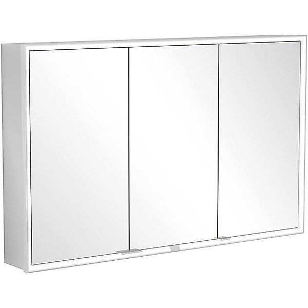 Der Einbau-Spiegelschrank My View Now von Villeroy & Boch überzeugt mit einem durchdachten Gesamtkonzept und cleveren Detail-Lösungen: Das komplett um die Spiegelfläche verlaufende Lichtband mit austauschbaren LED-Leuchten sorgt für eine optimale Ausleuchtung des Gesichts von allen Seiten. Über einen Sensorschalter kann das Licht von außen ein- und ausgeschaltet sowie die Helligkeit und Licht-Temperatur stufenlos geregelt werden. Für ein komfortables Öffnen der Tür ohne Fingerabdrücke sorgen die filigranen Griffe. Das Innere bietet großzügige Stauraummöglichkeiten und zwei integrierte Steckdosen. Die höhenverstellbaren Ablageböden aus Aluminium sind besonders reinigungsfreundlich und bieten ausreichend Stellfläche. Mit einer erhöhten Kante sorgen sie für mehr Schutz vor herausfallenden Badutensilien. Die nützliche Magnetleiste und die Ablageschale sind neben Vergrößerungsspiegel inklusive. Eigenschaften: mit umlaufender, austauschbarer LED-Beleuchtung mit 3 Türen, beidseitig verspiegelt für perfekte Rundumsicht filigrane Griffausführung in Aluminium natur Lichtsteuerung über Sensordimmer Lichtfarbe: 2700 K (warmweiß) bis 6500 K (tageslichtweiß) Leuchtmittel: 1x LED-Hauptbeleuchtung / 36,96 W Schutzart: IP 44 Korpus: Aluminium Rückwand weiß matt beschichtet Montage in der Wand 1x Sensordimmer außen 2x Steckdose innen (Rechts) 4x Ablageboden aus Aluminium, verstellbar 1x Ablageschale, Vergrößerungsspiegel und Magnetleiste inkl. Befestigungsset