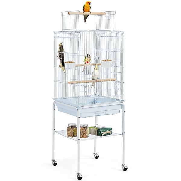 Beschreibung: Sie suchen ein perfektes Zuhause für Ihren Vogel und eine tolle Ergänzung für Ihre Wohnstätte? Dann ist dieser 136 cm Vogelkäfig mit interaktivem öffnungsfähigem Käfigdach und abnehmbarem Rollgestell eine kluge Wahl. Das Design des Dachs sorgt dafür, dass die Interaktion mit Ihrem gefiederten Freund verbessert werden kann und er sich gleichzeitig sicher und geborgen fühlt, wenn er sich im Inneren des Käfigs bei zwei Futterstellen und Sitzstangen aufhält. Wir haben uns aber nicht nur Gedanken um das Wohl Ihres Tieres gemacht, sondern kümmern uns auch um die Bedürfnisse unser Haustierbesitzer. Die leicht zu reinigende ausziehbare Schublade aus Kunststoff und er zusätzliche Ablage sowie die seitlichen Futterklappen, werden Ihr Benutzererlebnis daher sicherlich zusätzlich verbessern. Technische Daten: Material: lackiertes Metall, PP-Kunststoff Gesamtabmessung (bei geschlossener Oberseite): 46,5 x 46,5 x 119 cm (L x B x H) Gesamtabmessung (mit geöffneter Oberseite): 46,5 x 46,5 x 136 cm (L x B x H) Käfiggröße (mit geschlossener Oberseite): 46,5 x 46,5 x71 cm (L x B x H) Gitterabstand: 1,5 cm Ø Metalldraht: 3 mm, 2 mm Türöffnung: 39 x 29 cm (L x B) Abmessungen Unterbau: 45,5 x 46 x 58,5 cm (L x B x H) Größe Ablage: 42 x 42 cm (L x B) Gewicht: 8,3 kg Hinweise: 1. Bitte beachten Sie, dass es aufgrund von manuellen Messmethoden zu einer Abweichung der Maßangaben von bis zu ± 1 cm kommen kann. Lieferumfang: 1 x Vogelkäfig 2 x Kunststoff-Napf 1 x Käfigboden 1 x Montageanleitung in Deutsch